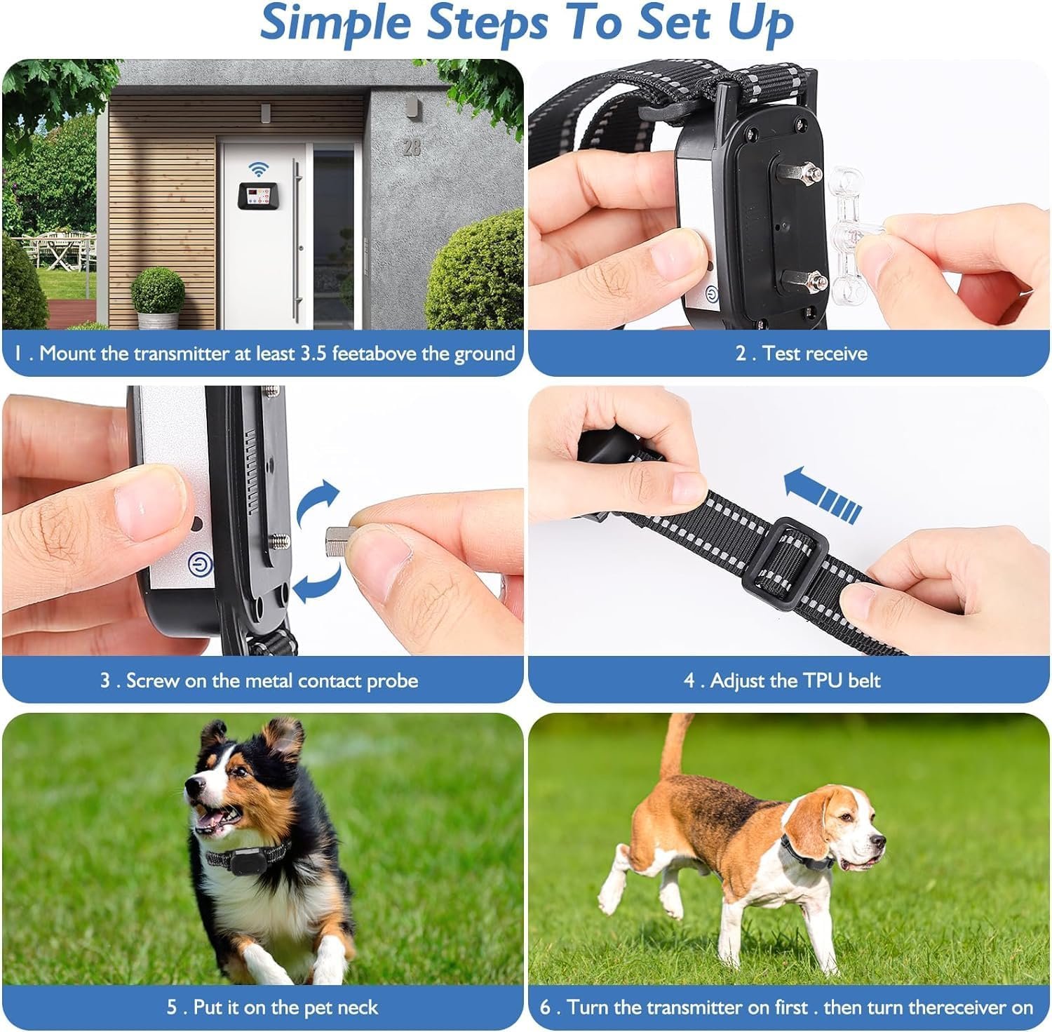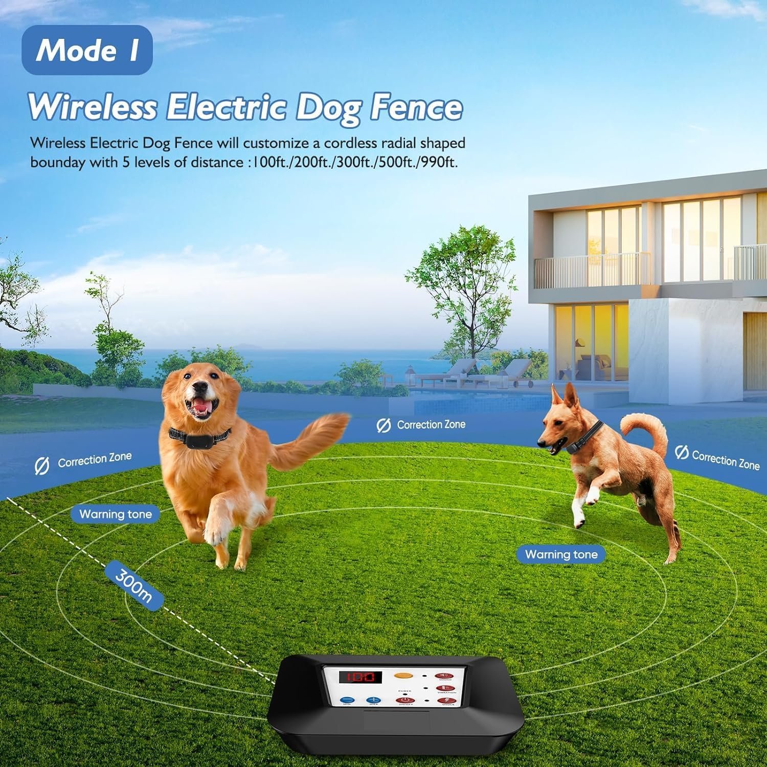 【Wireless Dog Fence Mode】Under wireless fence mode, one transmitter can connect with several receiver collars. You do not need to manually pair them. They will be connected automatically after power on. Signal range is up to 990ft in radius. When your dog is out of range, the receiver collar will make a warning tone, and then a 3.7V low voltage mild electrostatic shock will remind your dog to go back.The wireless dog fence also emits static electricity without harming dog’s hair.