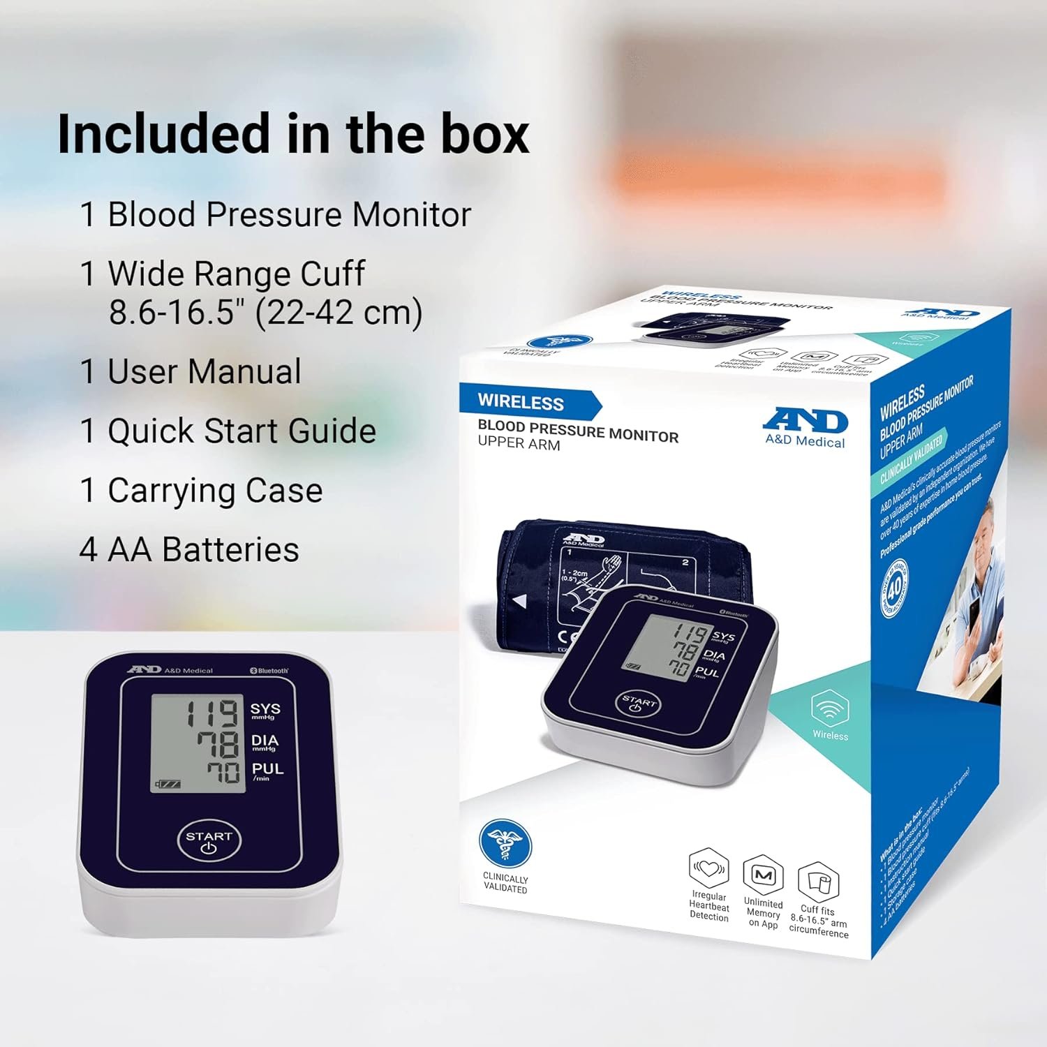 HOME BLOOD PRESSURE MONITOR: The A&D Medical Bluetooth BP machine gives accurate and trustworthy data results in the comfort of your home. The adjustable wide range cuff comfortably fits upper arms with a circumference ranging from 8.6 – 16.5″/22-42 cm