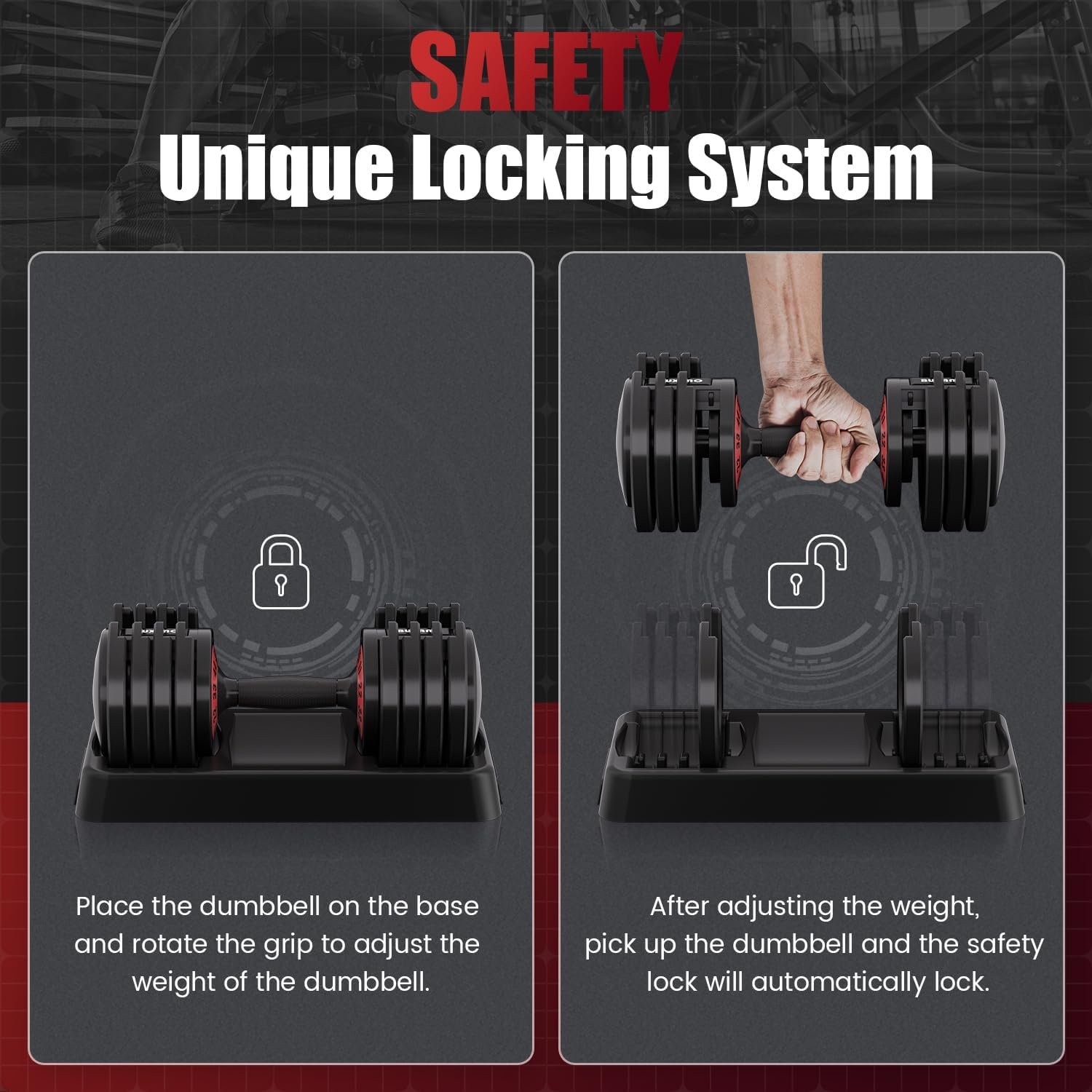 【Enhanced Safety Design】: Double safety buckles on the tray and handle bar, so that the adjustable dumbbells can only be adjusted on the tray, ensuring the stability and safety of the dumbbell pieces during exercise after leaving the tray.