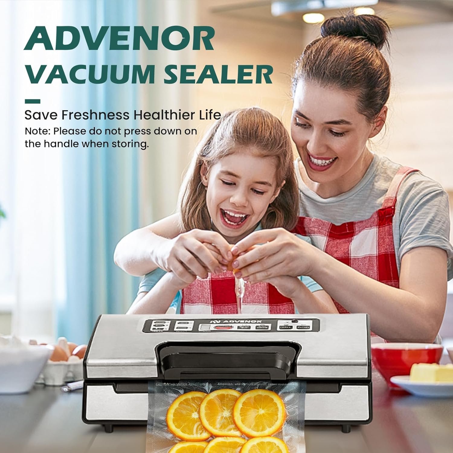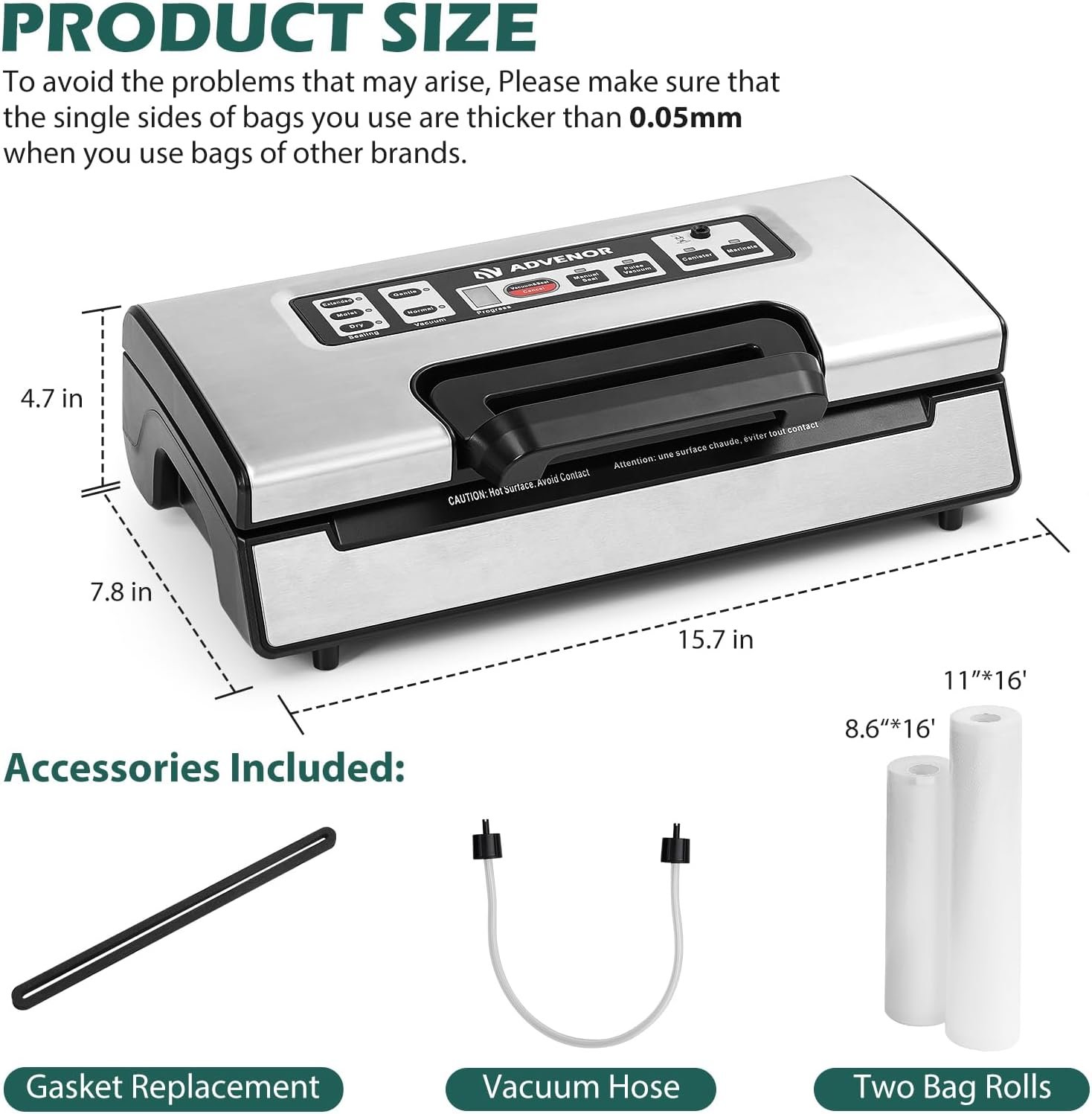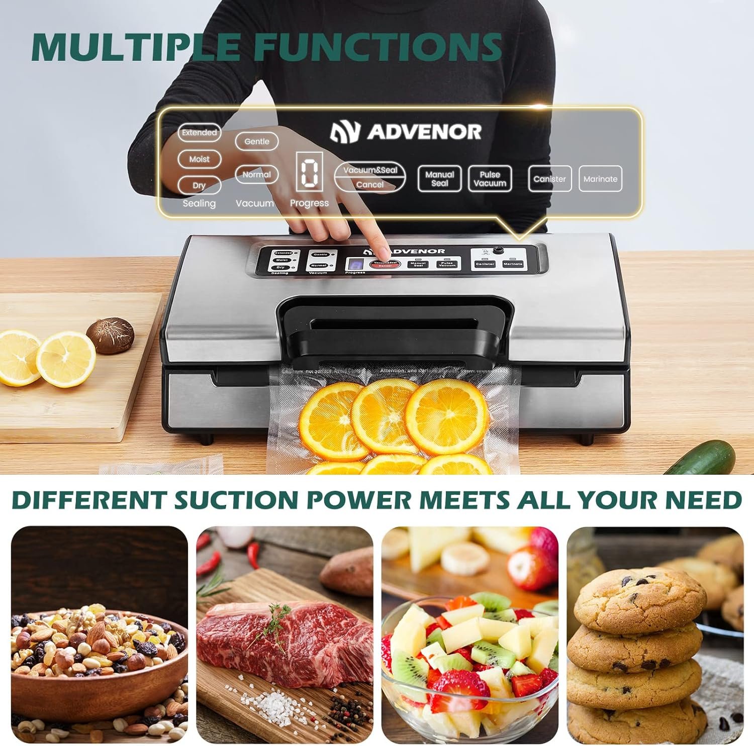 DOUBLE HEAT SEAL & EXTENDED SEALING ELEMENT ADVENOR vacuum sealer machine has double heat seal which provides extra strength and security especially sealing liquid or moist foods. And allows you to seal multiple bags in one time.