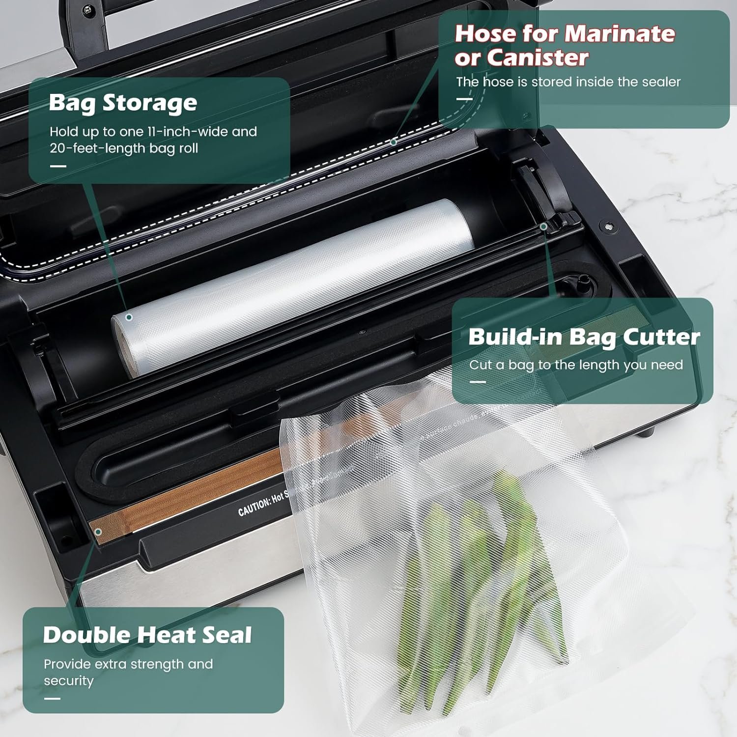 BUILT-IN BAG STORAGE & SLIDING CUTTER Conveniently stores up to 11-inch-wide and 20-feet-length vacuum sealer bag roll and easily gets custom-sized bags for your needs,also provide an accessory port for vacuuming containers.