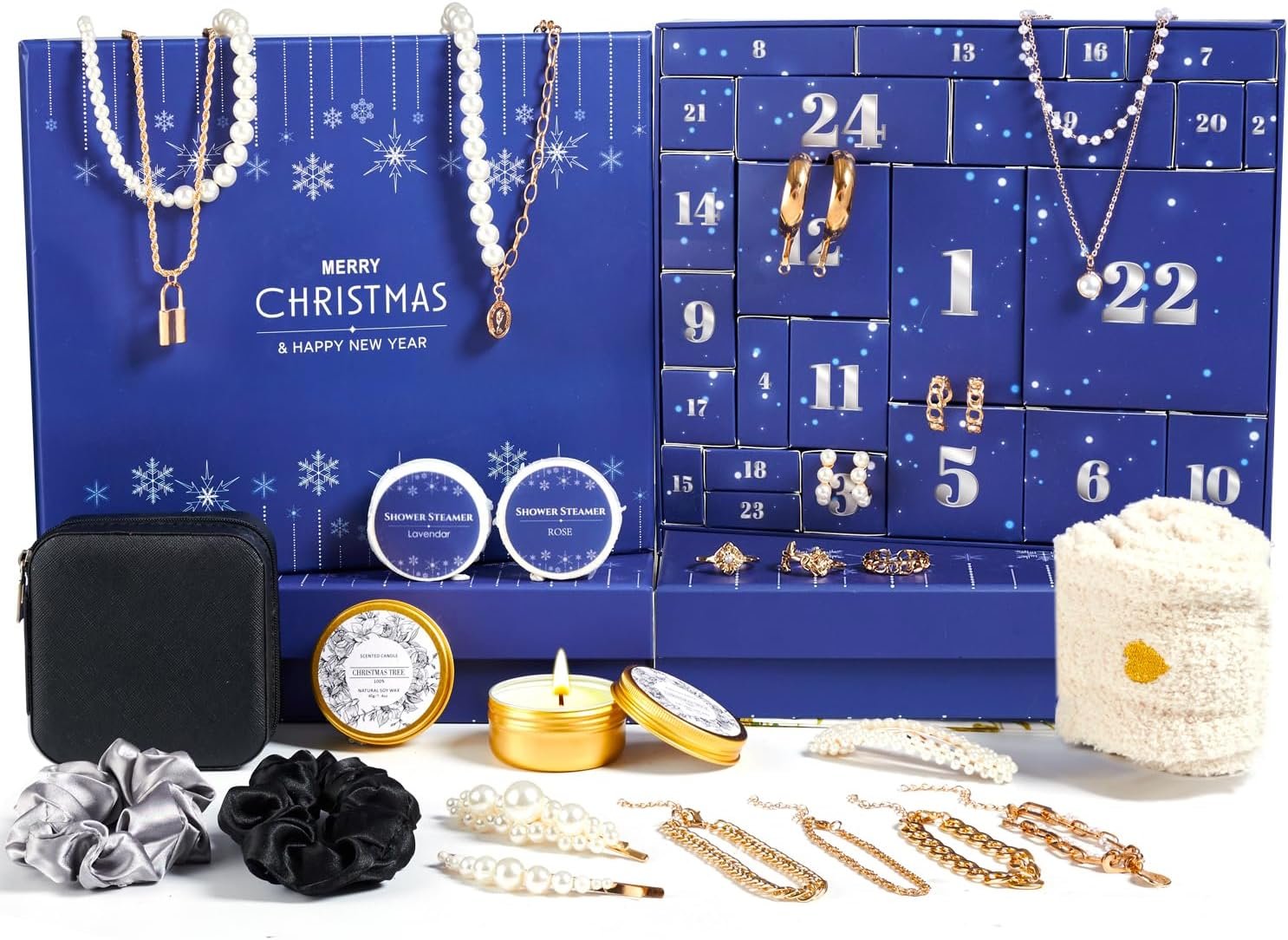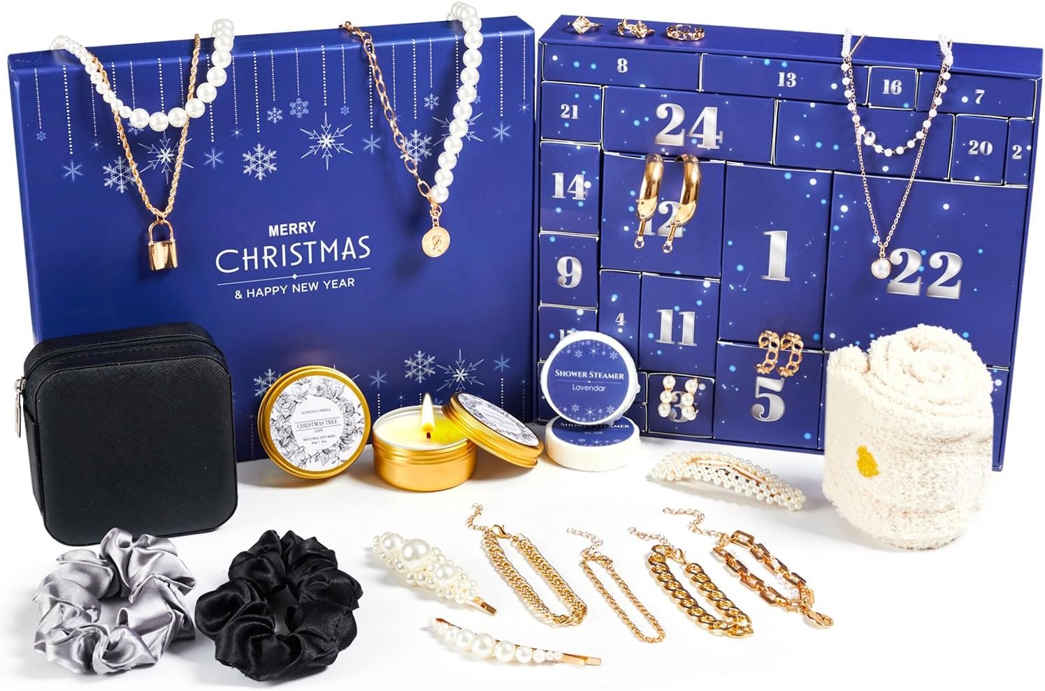 Advent Calendar 2023 Adult Women Teen Girls, 24 Day Christmas Countdown Calendar with Fashion Jewelry Necklace Rings Earrings, Scented Candle Bath Shower Steamers Xmas Surprise Gifts for Mom Daughter Sister Boss Lady