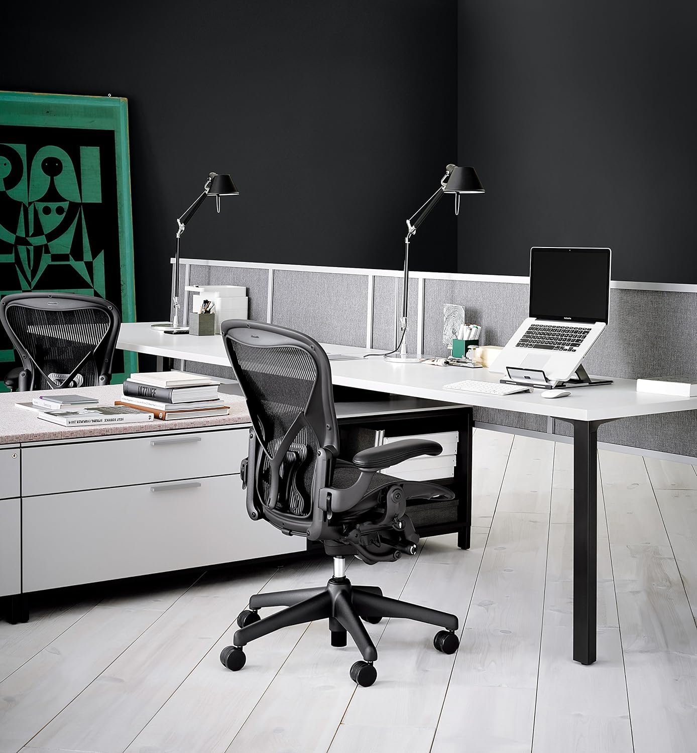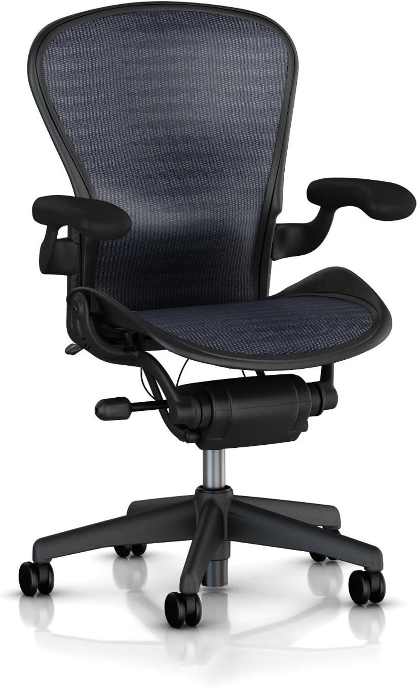 Exceeding all expectations and standards of its predecessors, the Aeron Chair, with its 12-year warranty, has become the new benchmark in the arena of ergonomic office seating. The innovative, now iconic design fits you and fits into your home. Instantly adaptable to all the motions you go through every day while seated, Aeron provides healthy comfort and balanced body support. An icon of modern design, the Aeron has earned a place in the permanent collection of the New York Museum of Modern Art. Features:Superior Ergonomics: The Pellicle suspension conforms to your body, reduces pressure points, and provides unparalleled support.Be One With Your Chair: The patented Kinemat tilt mechanism lets your neck, shoulders, hips, knees, and ankles pivot naturally.Stay Cool: The unique breathable Pellicle suspension dissipates the body heat that builds up while you work, so it keeps you cool and comfortable.Stay Alert: The high, wide, contoured back takes the pressure off your lower spine. Armrests slope slightly down in the back for the most natural and comfortable support. The “waterfall” front edge of the seat takes the pressure off your thighs, so your blood keeps circulating and you stay alert and focused.Make Your Aeron Your Aeron: Easy-to-make adjustments let you make the Aeron chair work just right for the way you work.It’s Got the Look: It fits right in, whether your home office is high-tech, elegant, casual, or a room that doubles as a gym.Green, No Matter What the Color: More than half of each chair is recycled materials, and the chair is 94 percent recyclable. Best in its class, the Aeron chair offers superior comfort, body support and style in a design that redefines the very meaning of “work chair.”