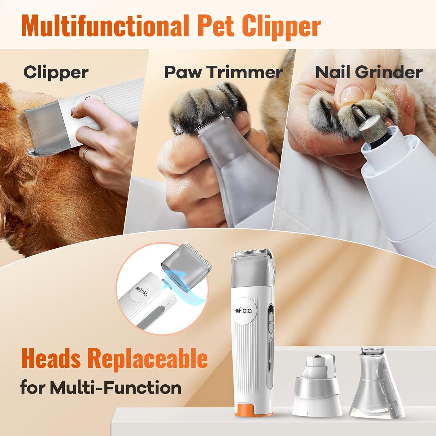 🐈 Electric Wireless Clipper for Portable Use: The dog grooming clipper is in-built with a rechargeable battery, which can be used off the hose. You can follow your pets around without distance limitations when trimming. The clipper head can be easily replaced as a paw trimmer and nail grinder that is ideal for exhaustive grooming styling.