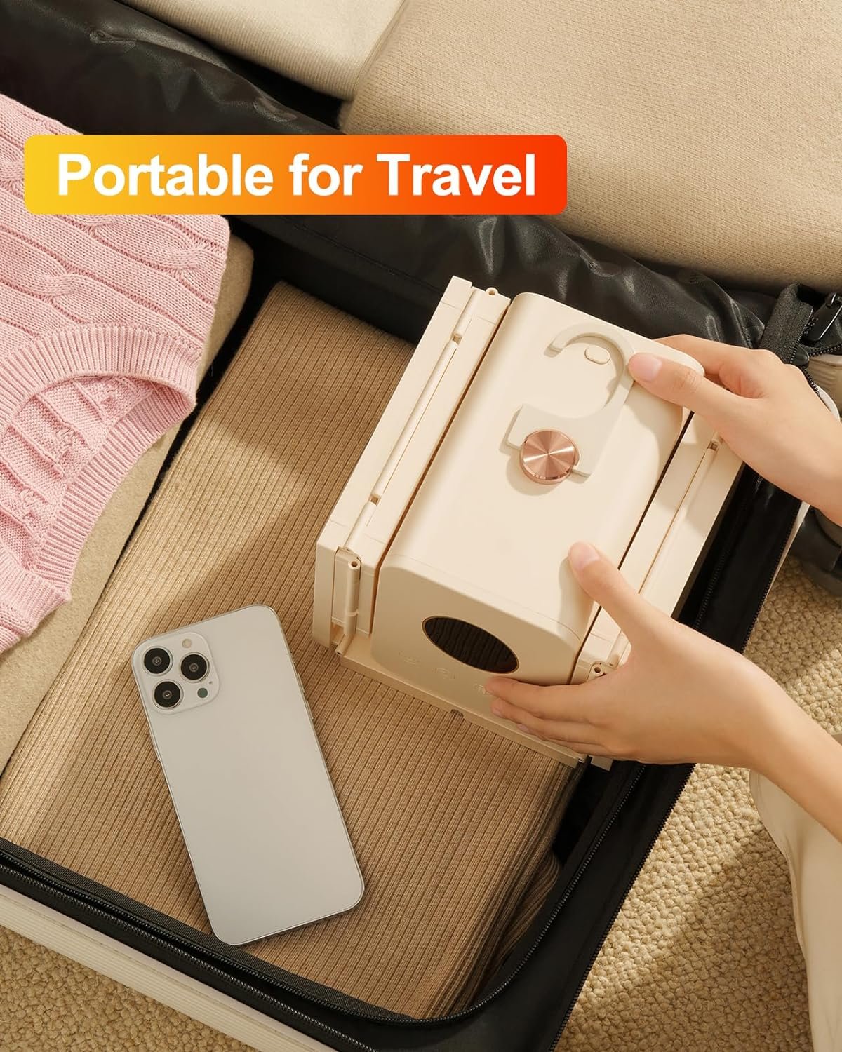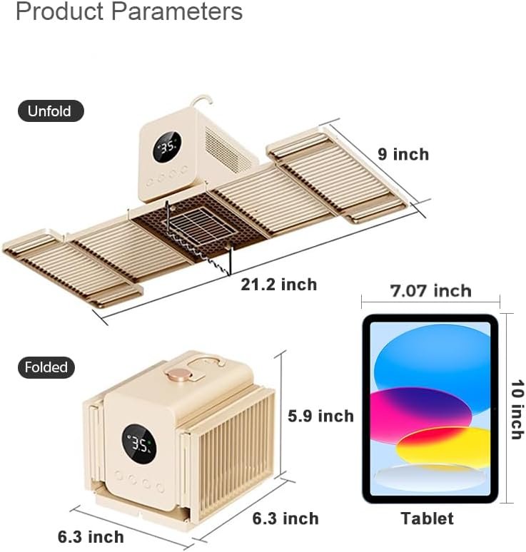 👍【Portable and Compact】This foldable clothes dryer machine measures only 6.2*6.2*5.9 inches when folded, making it perfect for small apartments, RV and limited laundry spaces, or for use during travel or camping trips. Weighing just 2.9lbs, it’s lightweight and easy to move around, the power cord features a hidden design concept (but to maintain optimal power supply efficiency and final storage results, the cord length is 59 inches), making it a convenient solution for individuals with busy schedules or those constantly on the go.
