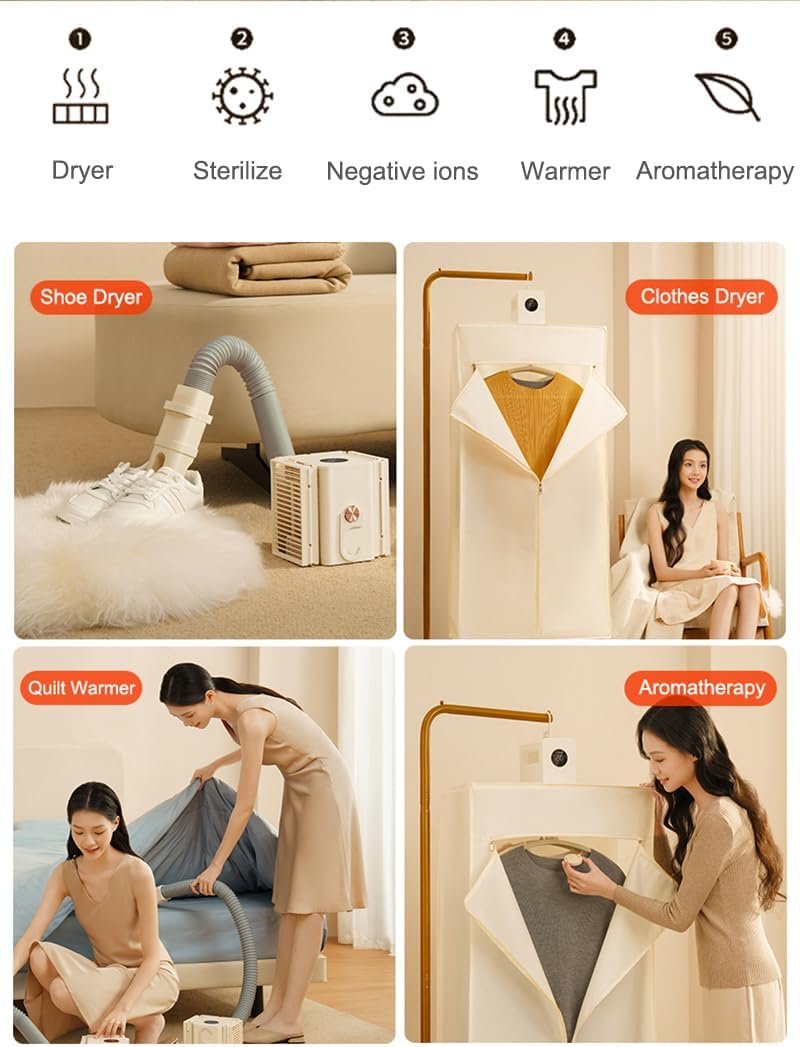 ❤【Multifunctional Drying Mode】The portable drying machine offers multifunction mode drying to cater to different needs. Warming dry hose included in the set for warming quilts or drying shoes. The 40~50℃ warm air mode gently dries delicate fabrics such as silk, wool, and other valuable clothes without causing damage. The 55~65℃ hot air mode quickly dries everyday materials like cotton, linen, nylon, and polyester.