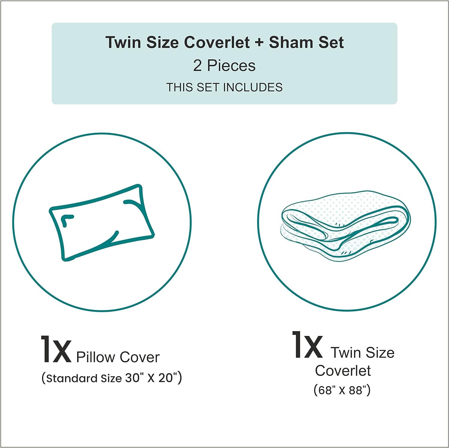 1 Twin Bedspread 68″ X 88″ + 1 Sham 30″ X 20″. Oversized – Great coverage along the sides of bed.