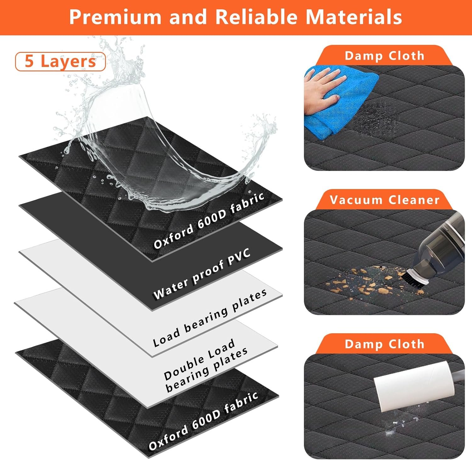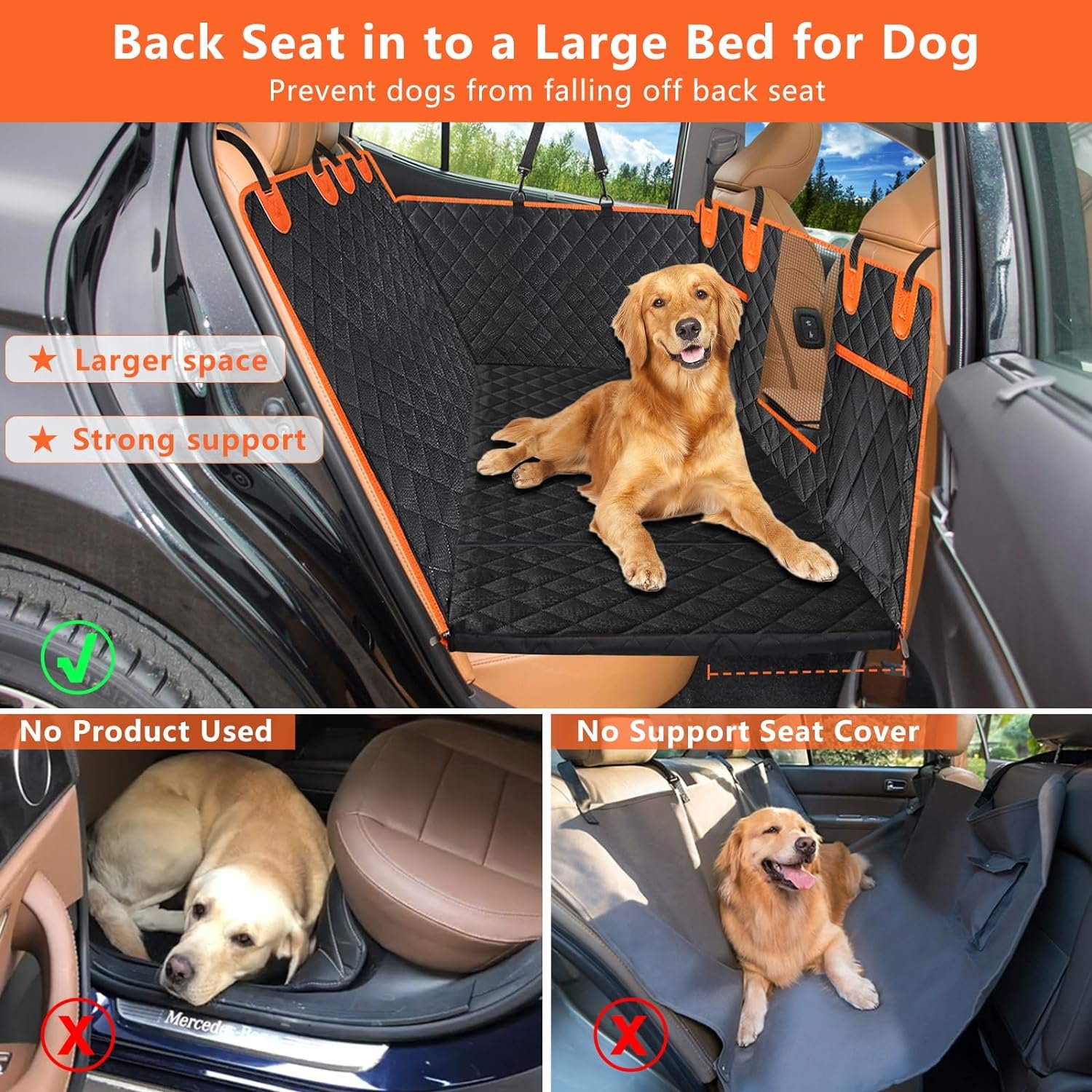 ăHard Bottom Design& Waterproof Non-Slipă: Crafted from durable 900D Oxford fabric with a PVC waterproof coating and non-slip backing. The five-layer design for hard Bottom turns all the space in the back seat into a resting space for dogs. The back seat becomes a car bed, ensuring stability and comfort for your pet.