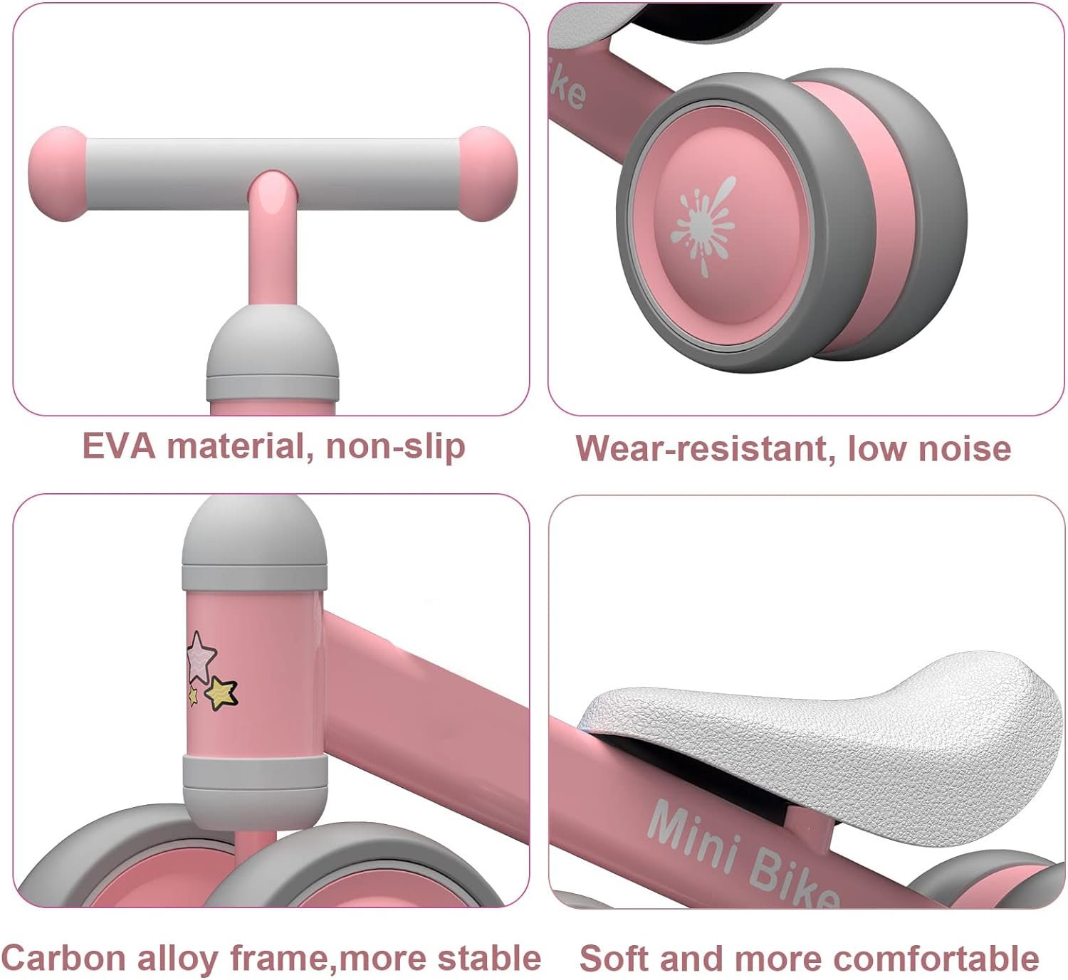 😊Recommended Age: This baby balance bike is suitable for babies aged 10-24 months who are learning to walk or developing their balance. It weighs only 4.4 lbs and can support a maximum load of up to 100 lbs.