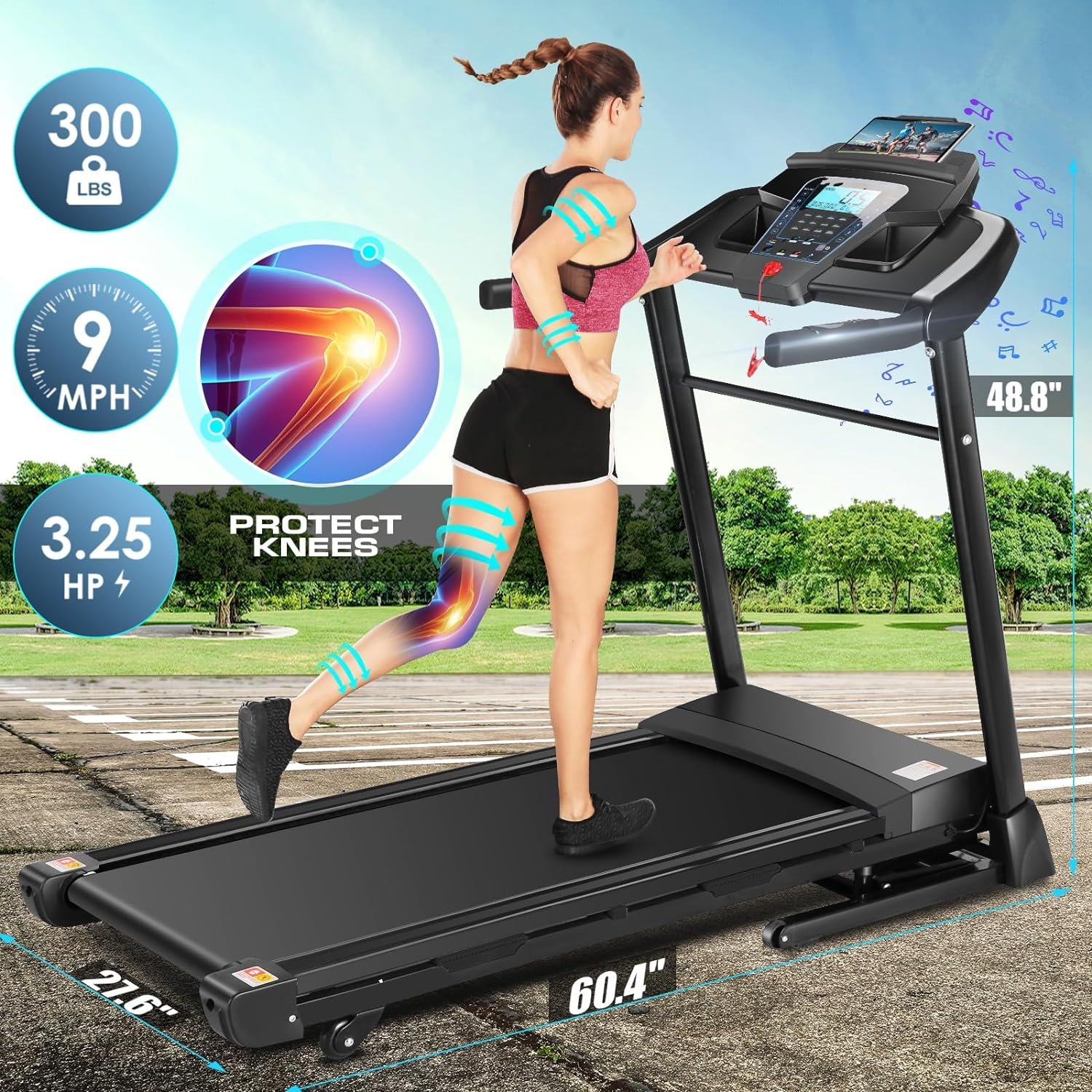🏃‍♂️【 300 lbs Weight Capacity & Highly Stable】: This treadmill machine has a solid steel frame with a weight capacity of 300 lbs. It’s also highly stable, with no shaking or slipping when you walk, jog or run; Compact design with wheels makes this exercise treadmill easy to move around and store; Connect your phone or tablet to enjoy your favoriate media via Bluetooth and the speakers delivers vibrant stereo sound.