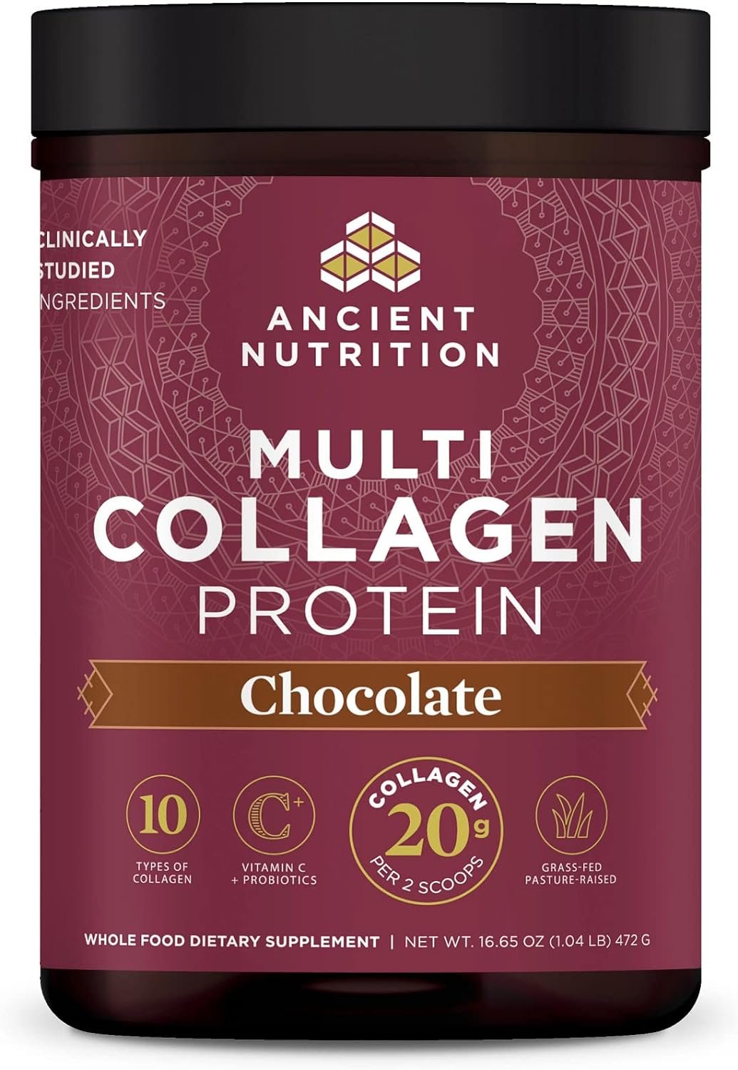 EASY TO USE AND PACKED WITH NUTRIENTS: Two scoops of Ancient Nutrition Multi Collagen Protein powder in our delicious chocolate flavor provides 20g of collagen, 18g protein, 200% DV of Vitamin C and 4B CFU* probiotics (*at time of manufacture)! Add 2 scoops to any smoothie, protein shake, tea, coffee or your favorite drink for a daily boost of collagen protein and joint support..