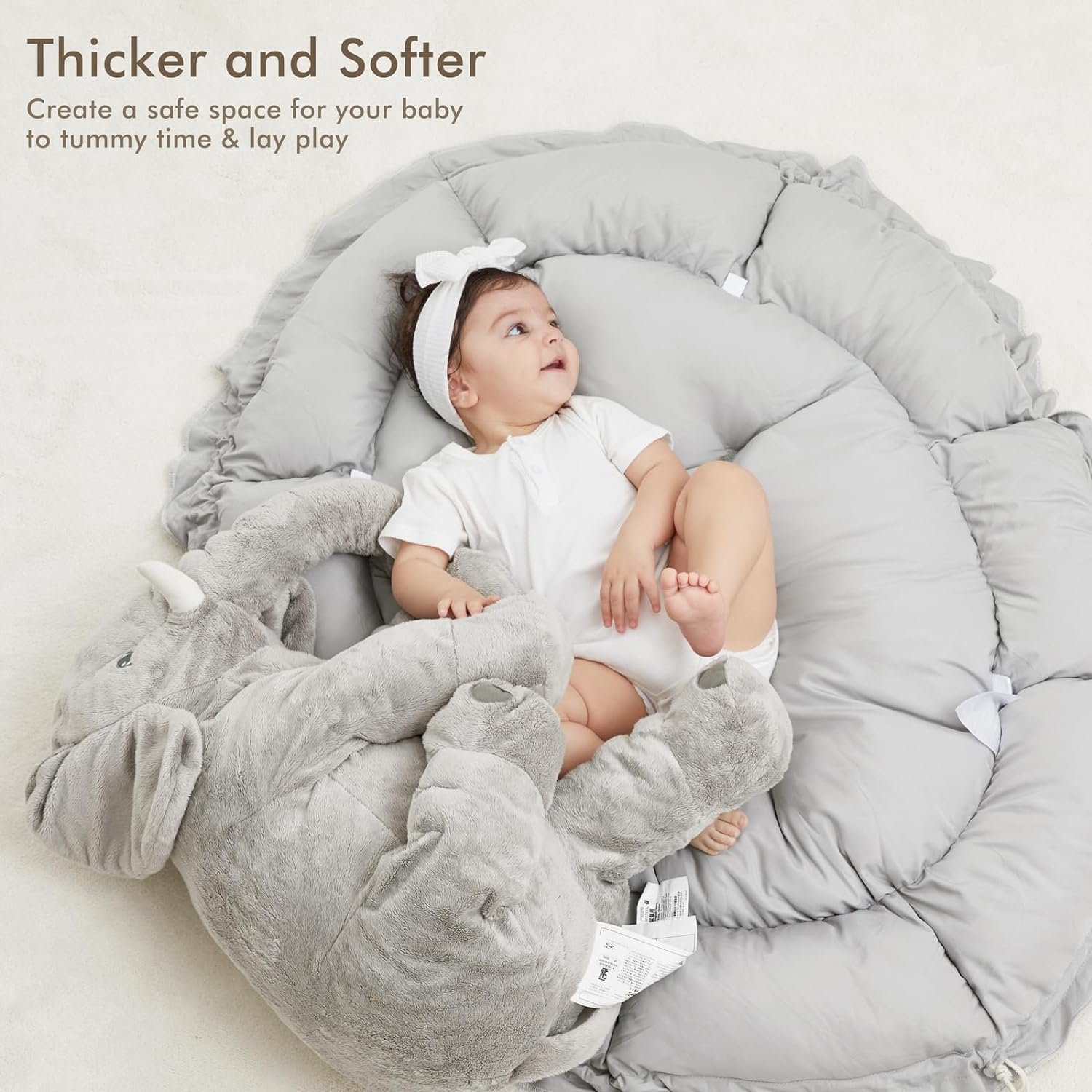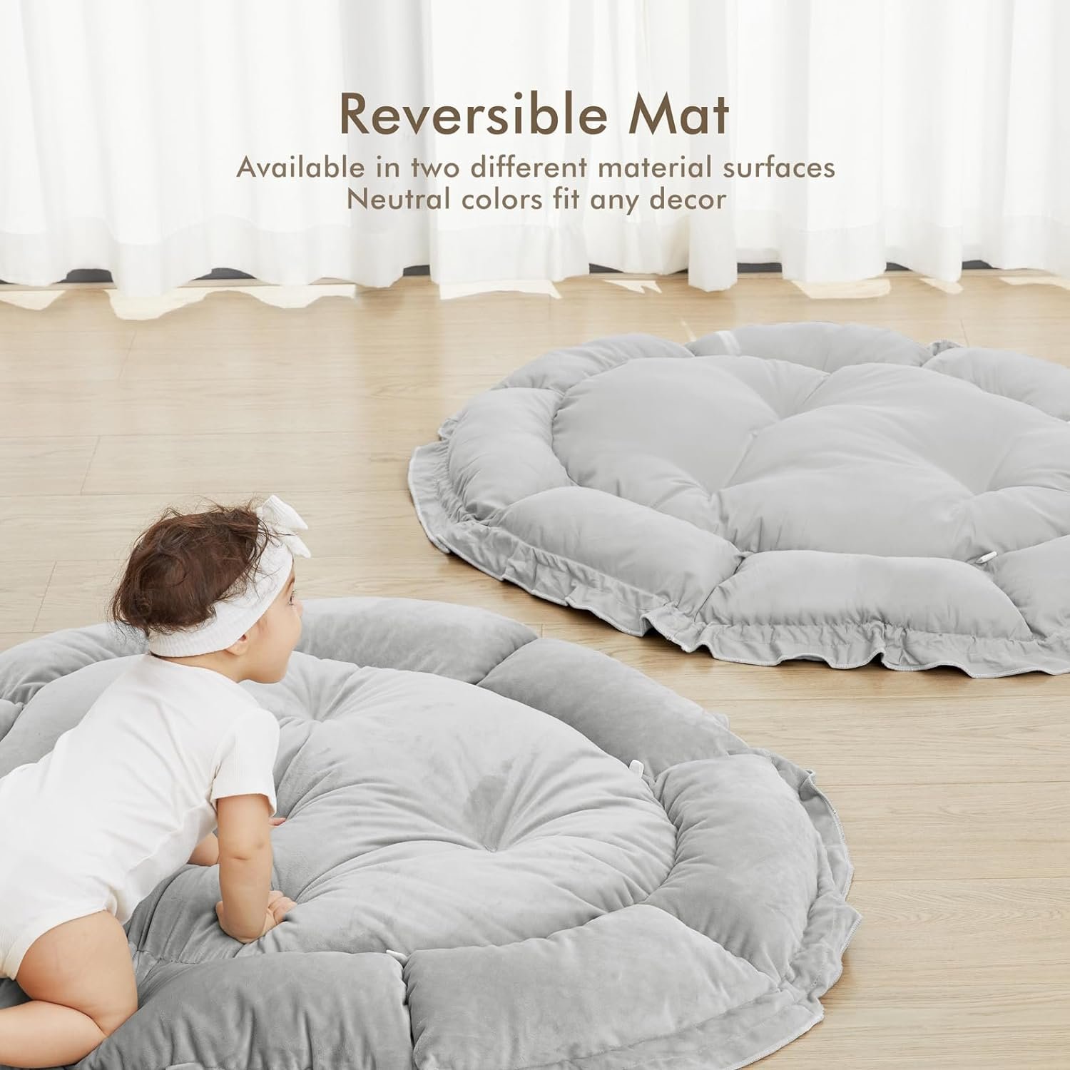THICKER & SOFTER: The reversible play mat crafted from premium plush material, offers a fantastic amount of cushion. Its neutral color scheme blends in with your home’s aesthetic so you can keep it out even after playtime is over.