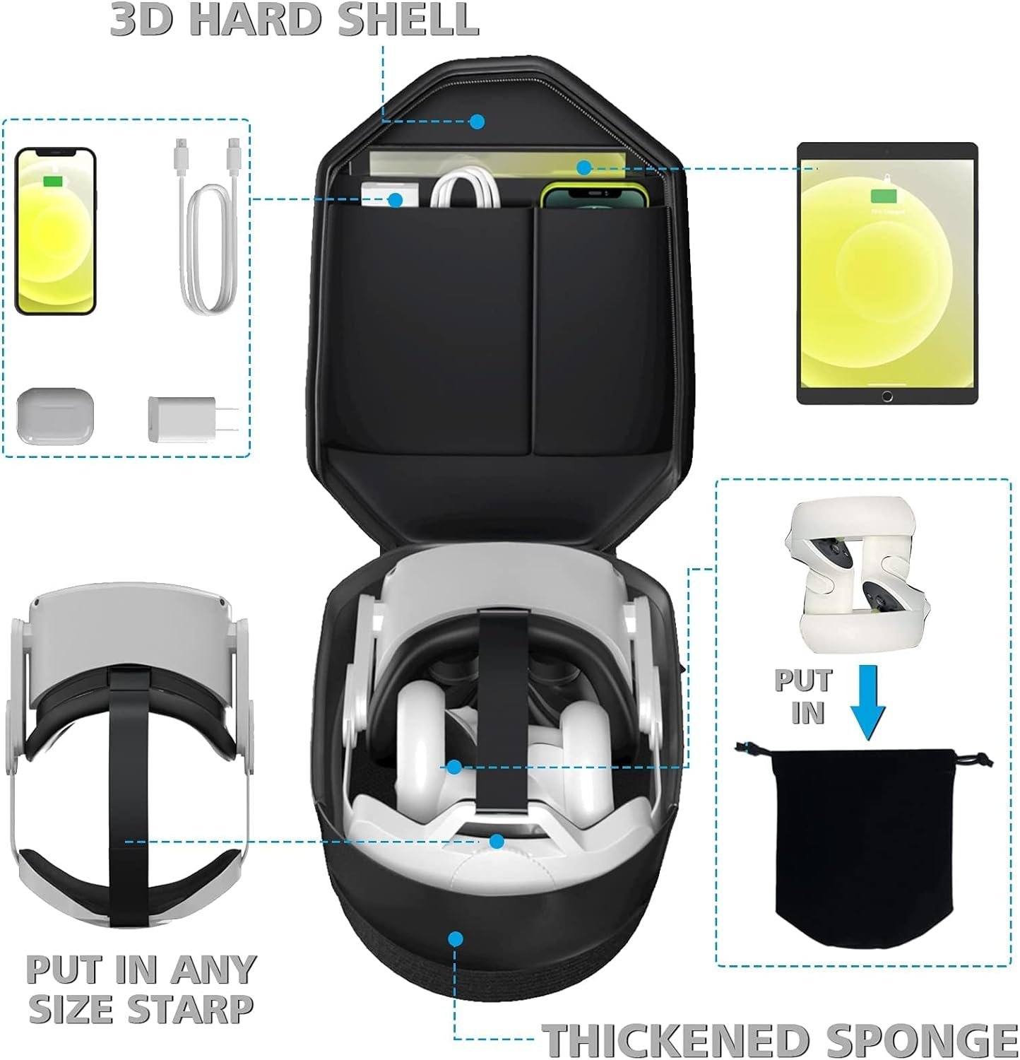 Compatible with All Replaceable Elite Strap: The case is compatible with Oculus Quest 2/ Meta Quest 3 & elite strap with battery & KIWI Design/BOBOVR head strap and all. Solves the concern of not being able to carry a third-party elite strap.