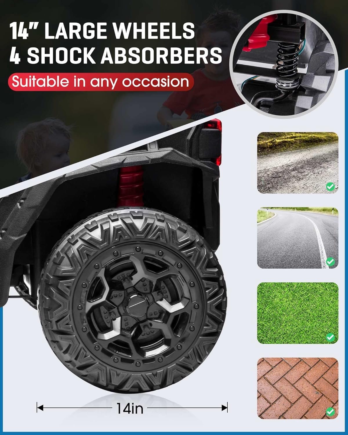 SAFE DRIVING WITHOUT WORRY: The remote control can override the manual mode, just press the P button to activate emergency braking when there is any potential danger; 4 anti-skid wheels with spring suspensions ensure smooth driving; the key-start and the soft start design, the lockable doors on both sides, all ensure driving safety and protecting children in all aspects