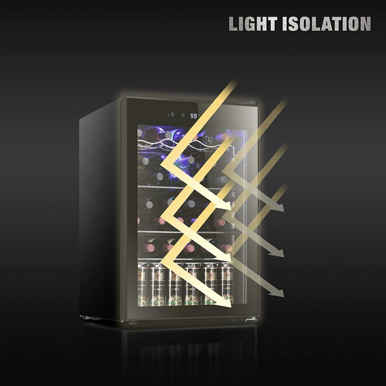IDEAL LIGHT and HUMIDITY: With its reinforced glass door with air tight seal and help to maintain an ideal humidity level, this beverage refrigerator gives you a compact and modern design perfect for your living room . Blue soft LED interior lighting not only beautifully showcases the wine but won’t damage the wine.