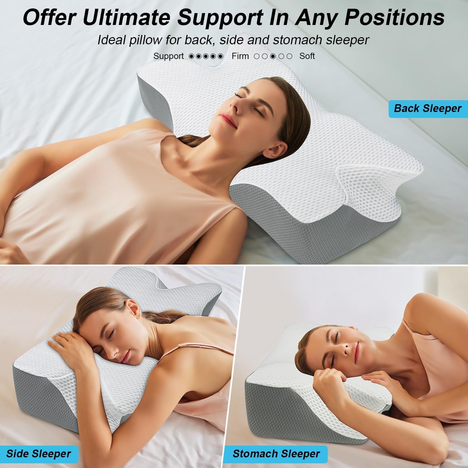 🌛【TWO HEIGHTS OF CERVICAL NECK PILLOW】Our neck pillows featuring two different heights so you can choose the right pillow to help achieve the deep night’s sleep. And two version, a firm & soft version, you’ll select the suitable neck pillow according to your sleep habit and preferences. High density 3-5s slow rebound memory foam maintains its shape and structure to provide unparalleled support. Certified by OEKO-TEX & CertiPUR-US (LAB REPORT I.D. : E392-2021-00556001).