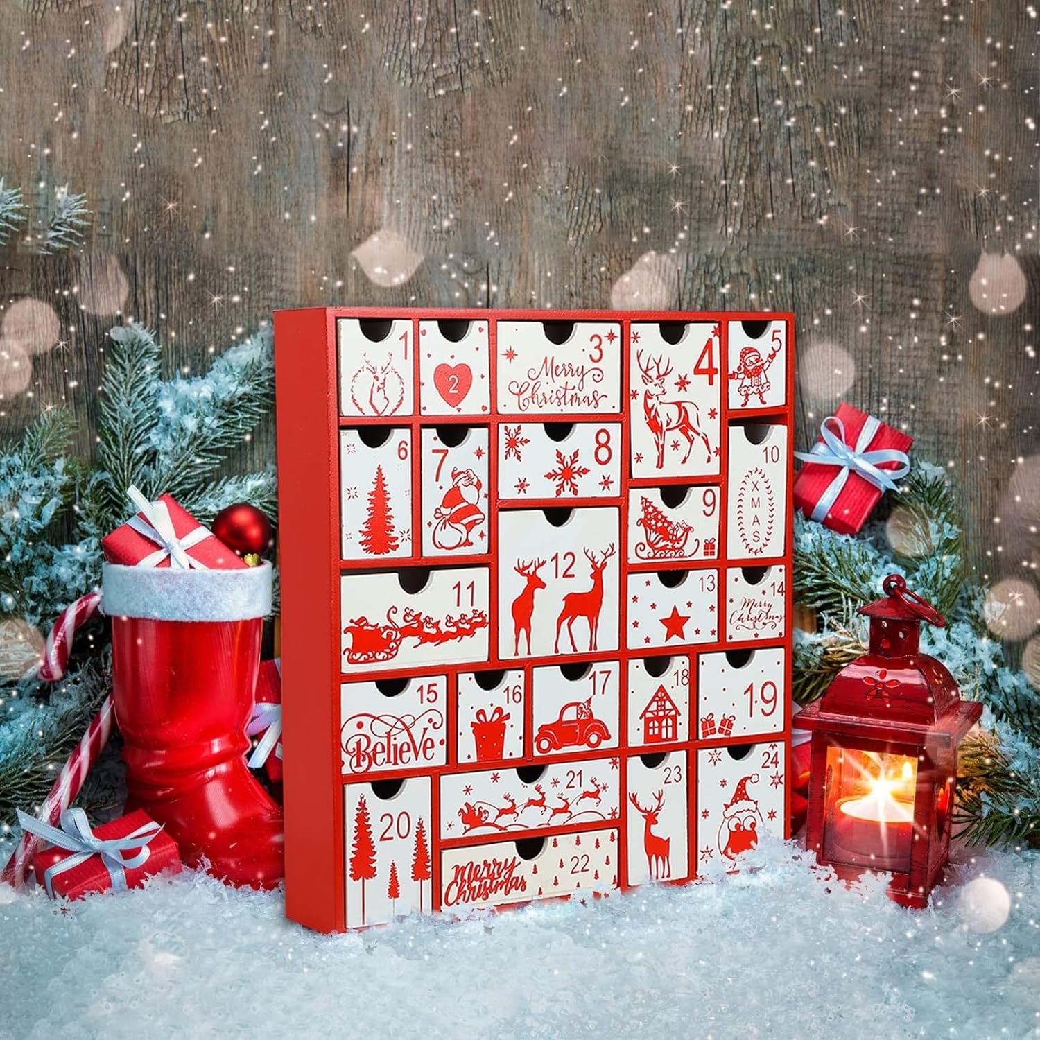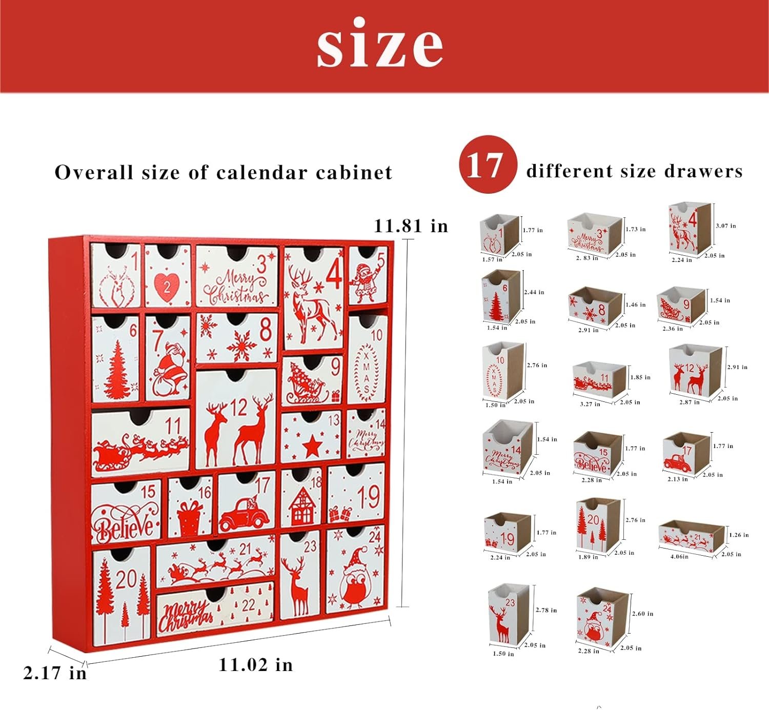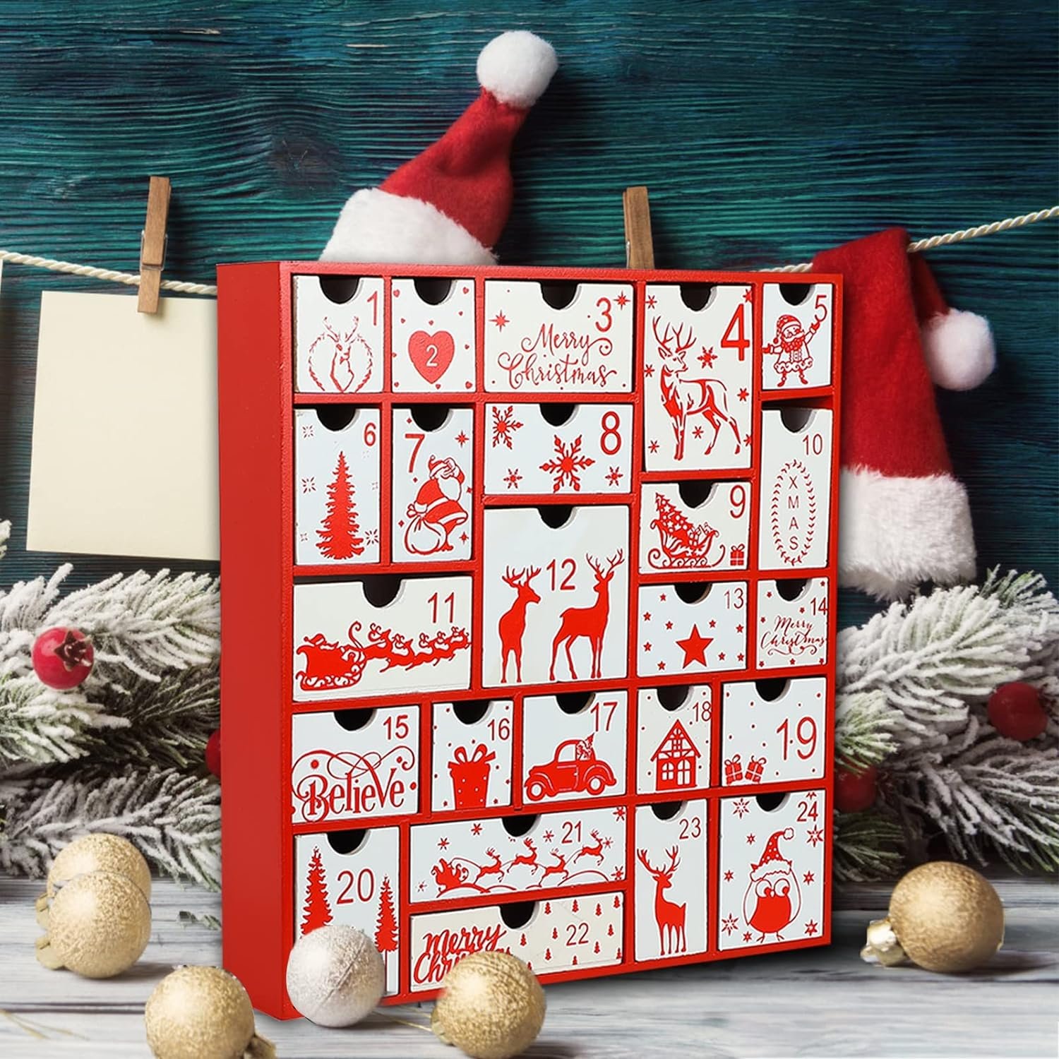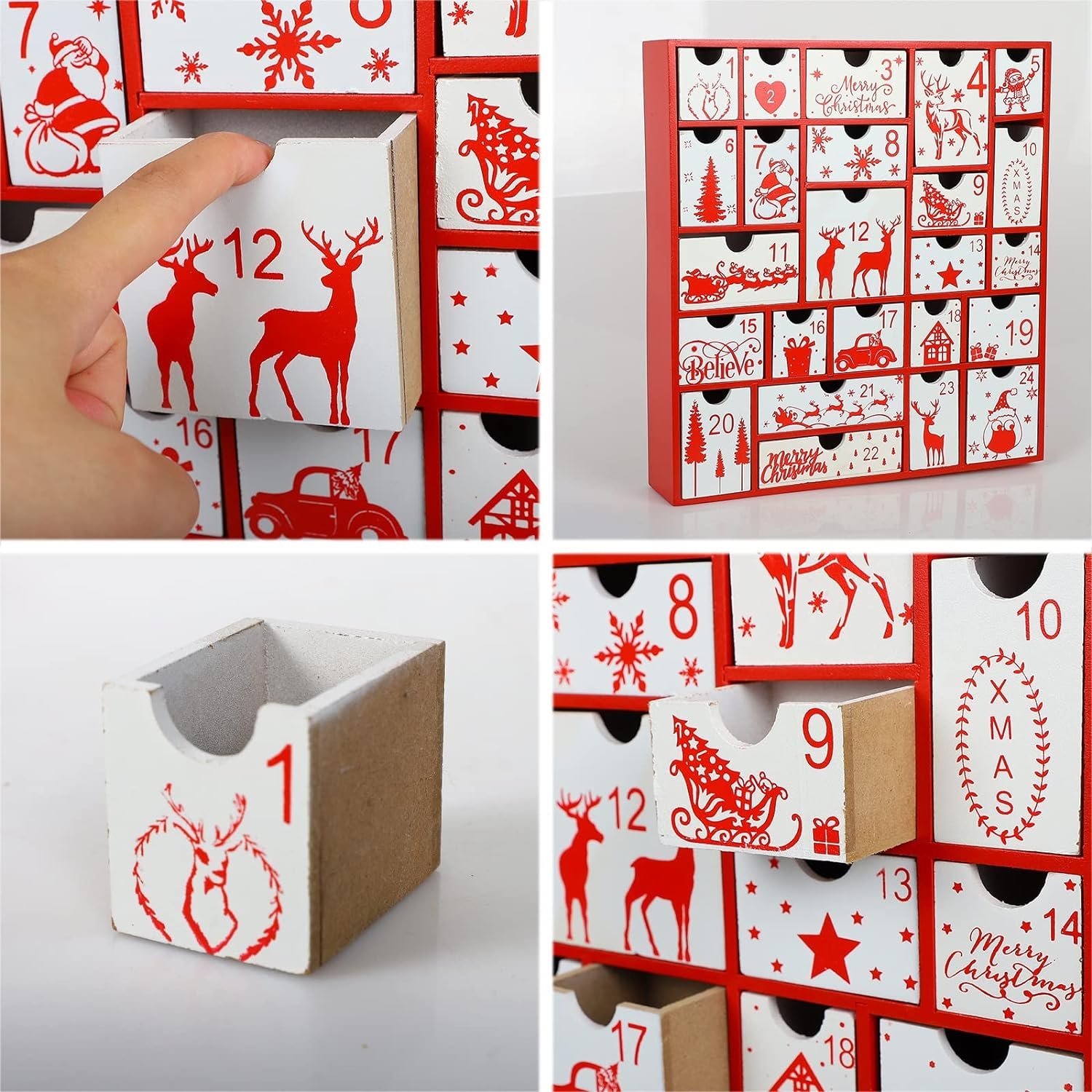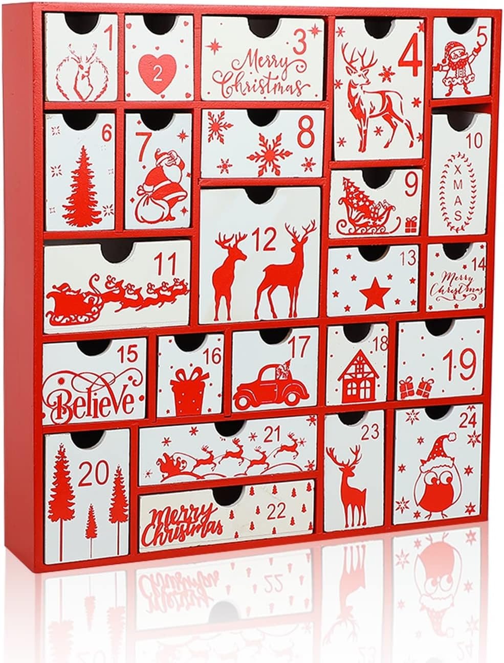 Christmas Advent Calendar – Aoutrow Christmas Calendar is designed with 24 numbered drawers which you can hide small surprises behind that kids and adults can look forward to opening each day. Such as small coins, treats, candies, toys, or even special messages. Each drawer measures 1.73″ deep.