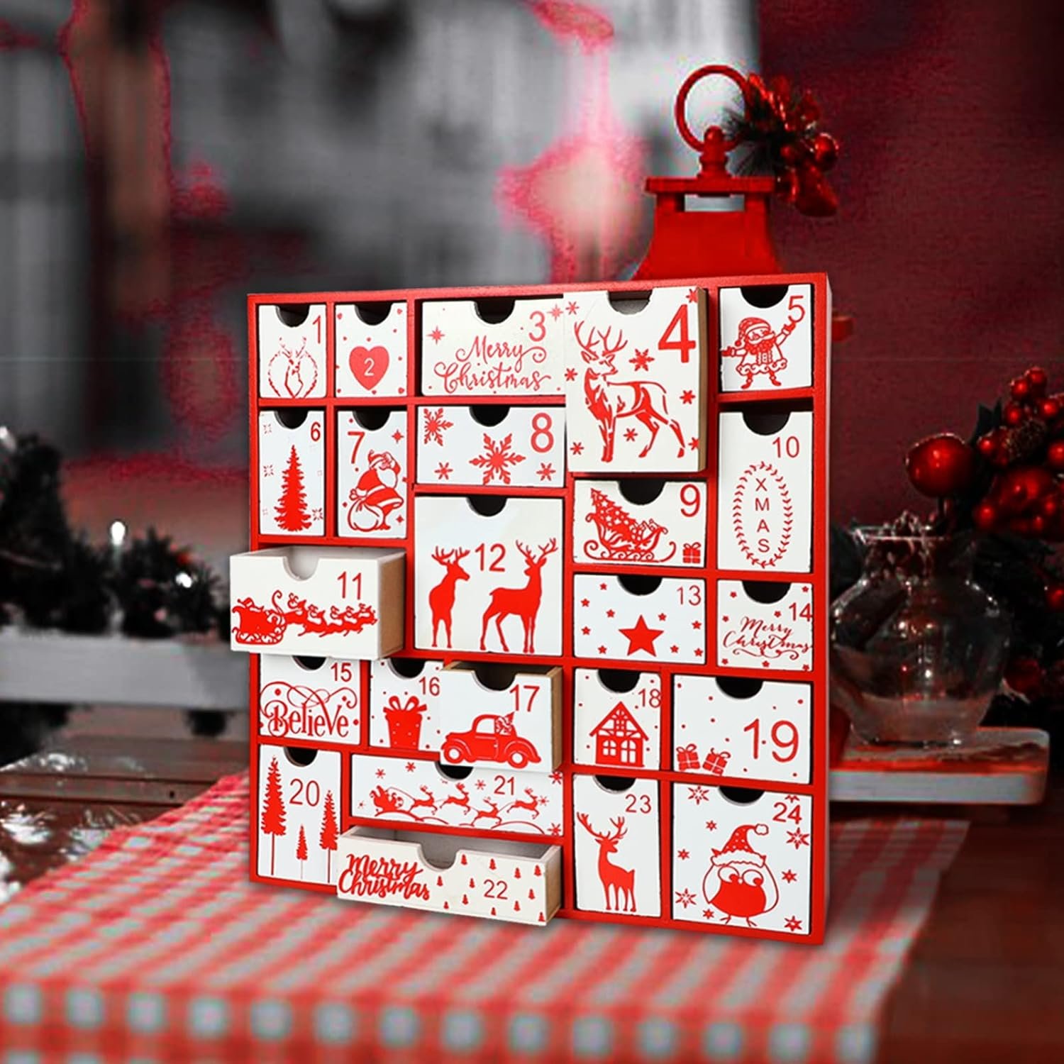 Aoutrow Advent Calendar with 24 Storage Drawers Countdown to Christmas, Christmas Advent Decoration 24 Day Red Wooden