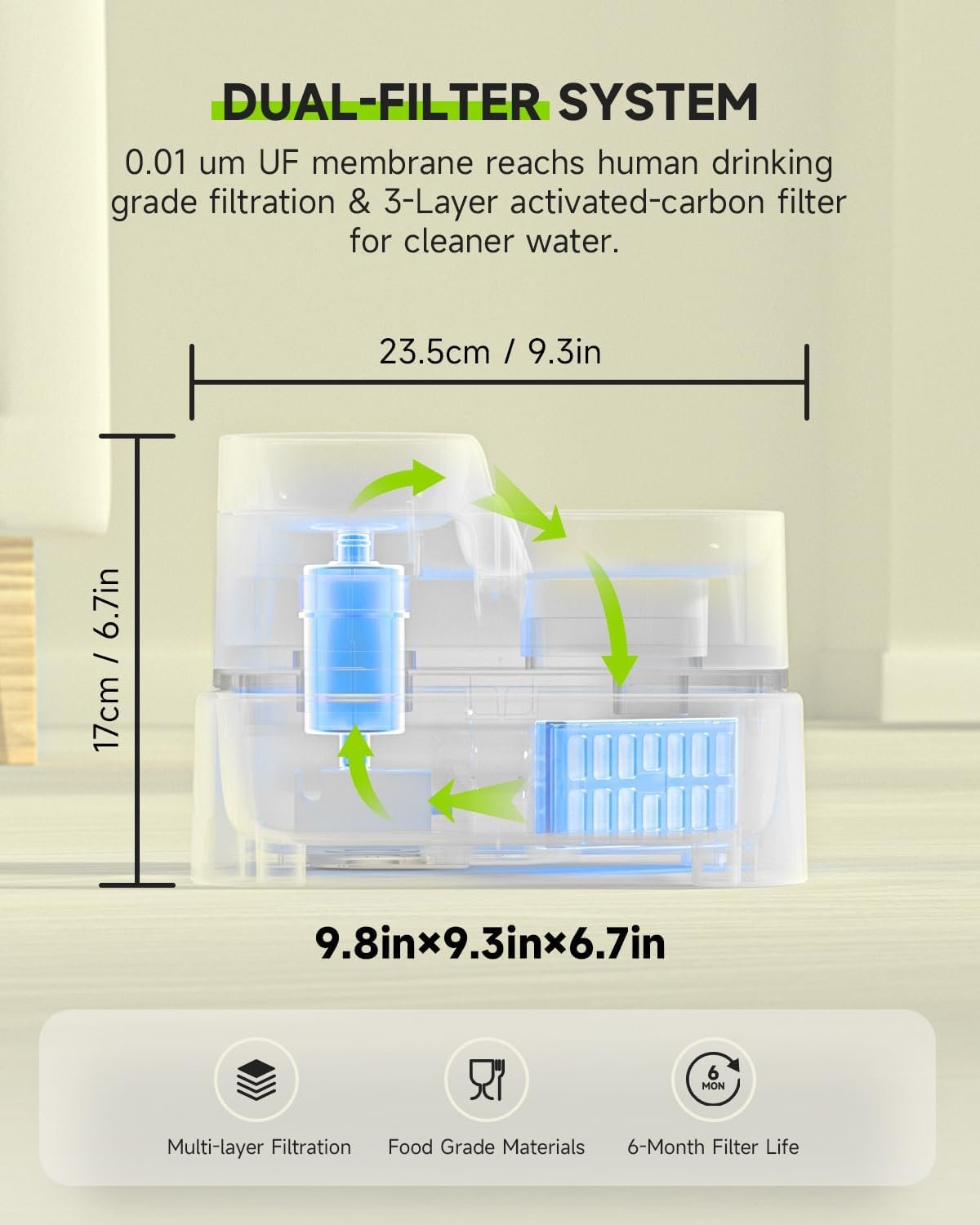 🐈[3L Capacity Substantial] APETDOLA Dog water fountain features a substantial 3L/101fl oz capacity coupled with a capacious water bowl, is ideal for not only cats but also dogs friends. Cat drinking fountain provides 2 quiet water paths designed to minimize the operation sound to 28dB, keeping your sensitive furry little surrounded by serenity all day.