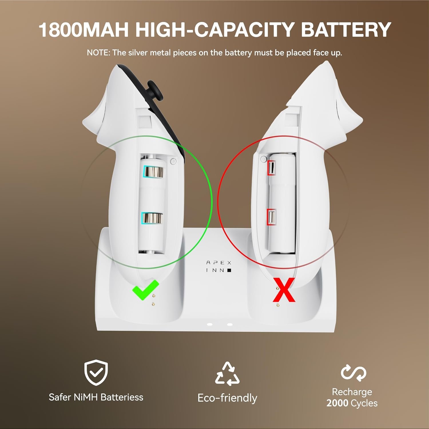 2pcs 1800mAh Rechargeable Batteries – Comes with two 1800mAh rechargable environmentally friendly and safe NiMH batteries for your Controllers. With these batteries, you get 2000 charging cycles.