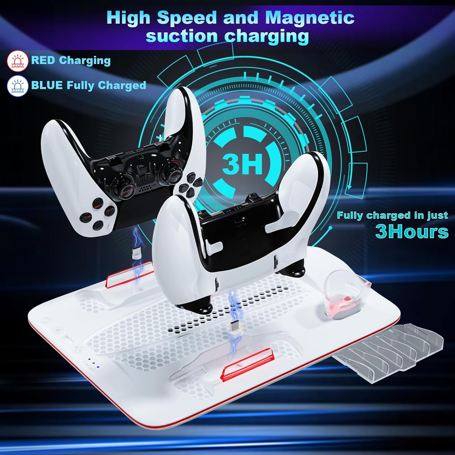 【3 HOURS FAST CHARGING & CLEAR INDICATOR LIGHT】: The PS5 Controller Charging Station Can Effectively Charge Two PS5 Dualsense Controllers At The Same Time In About 3 Hours. The Led Indicator Clearly Shows The Charging Status: Transparent Means Standby, Red Means Charging, And Blue Means Full. The Fixed Type-C Charging Port Can Prevent Poor Contact. At The Same Time, Smart Chip Protection Prevents Damage Caused By Overcharging, Overheating, Overvoltage, Overcurrent, Short Circuit, Etc., Which Can Better Extend The Battery Life.
