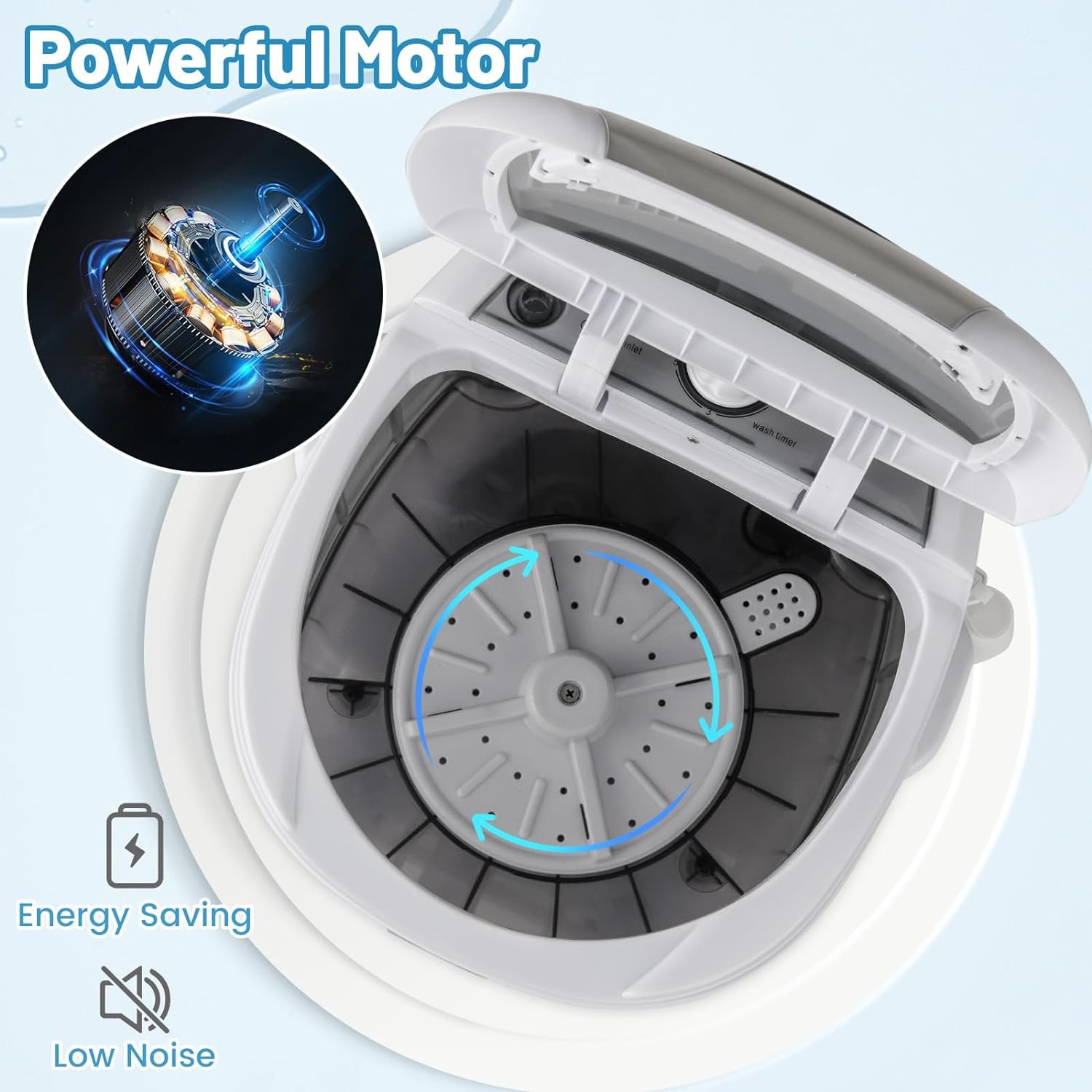 Our mini washing machine is the ultimate space-saving solution for laundry needs! With a single tub design combining both spinning and washing functions, it saves energy while providing efficient cleaning with 170W washing power. Despite its compact size, this washing machine offers ample washing capacity to meet various laundry demands, making it perfect for home, apartments, and dormitories. Weighing just 11lbs, it is easily portable for added convenience, ensuring a convenient and upgraded laundry experience.