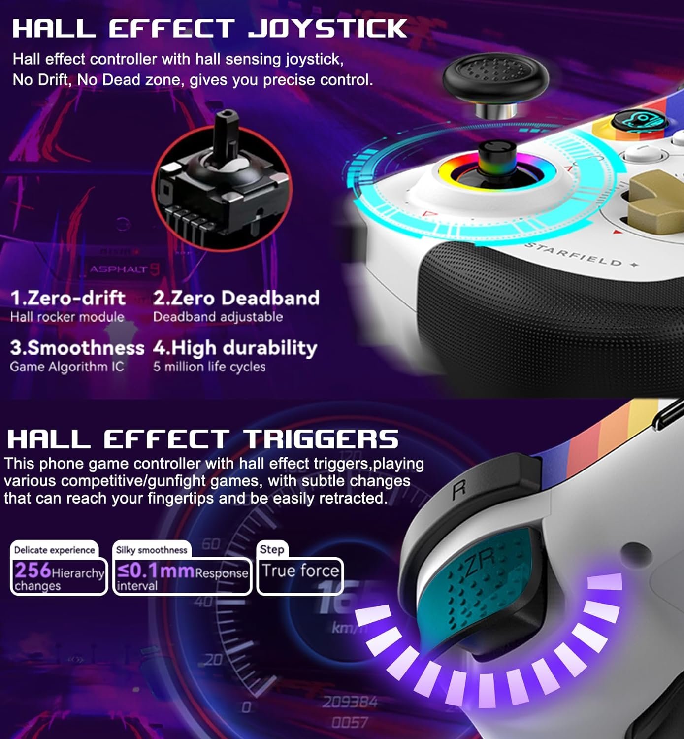 🕹️🕹️【HALL EFFECT JOYSTICKS & HALL LINEAR TRIGGER】arVin iPhone game controller designed for precise controls, with hall effect rocker and hall linear trigger, pressing accuracy up to 0.1mm that more accurate than traditional controller. Bid farewell to drift issues and revel in precise, dead zone-free control.