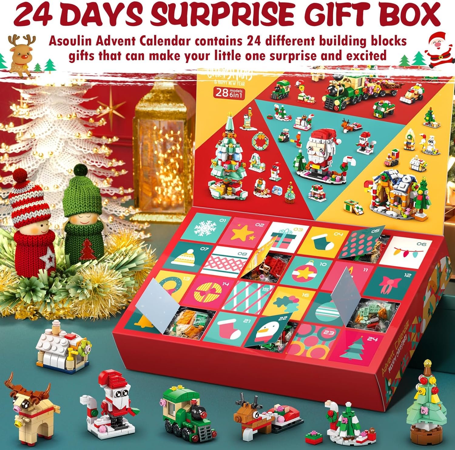 Asoulin Advent Calendar Building Set features 24 doors in the gift box, your little people can open a door each day and get a new gift.Each box contains 1 mini building toy set. Each package includes an easy-to-follow construction guide.Complete a mini building blocks toy every day between December 1st and 24th.Each 6 small Christmas models can be assembled into a large Santa Claus, Christmas Train, Christmas house & Christmas tree.