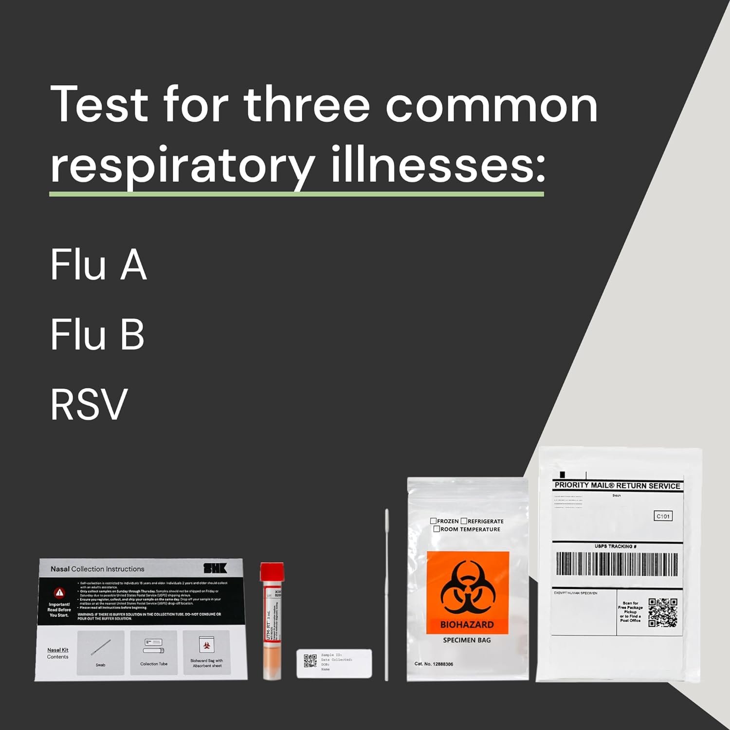 Tests for 3 Illnesses: A single, self-collected nasal swab sample test for three common respiratory illnesses, Flu A, Flu B & RSV. Test from the comfort of your own home