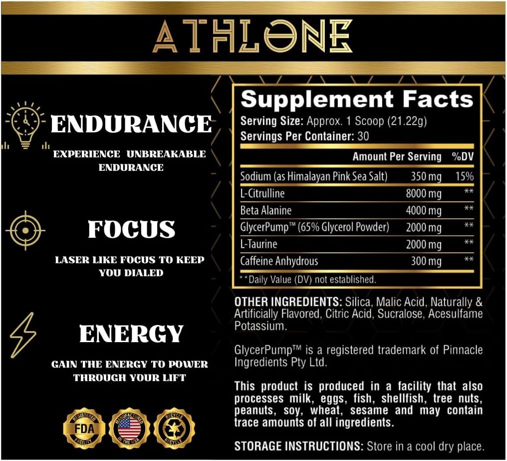 PUMP – Athlone Pre Workout’s pump is like nothing you’ve ever experienced before. The pump that ensues shortly after taking our pre will have you tossing your old pre in the garbage. Our premium formula was specifically designed with the pump in mind. Gym goers across the nation have left their old pre in the dust, never looking back after a single gym session with Athlone.