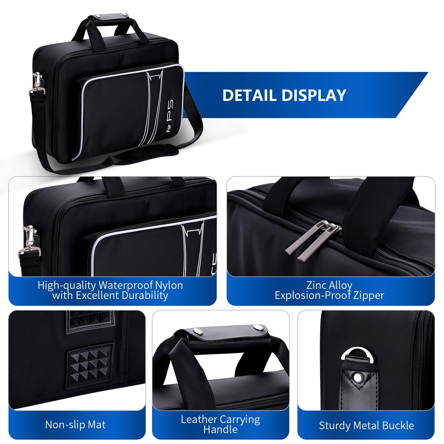 Leather carrying handle, which makes it easy to carry around.Sturdy metal buckles and dual zinc alloy explosion-proof zippers are durable to hold heavy PS5 consoles and accessories.Non-slip mat will be protected from scratches and impacts where you place it on the car or somewhere.