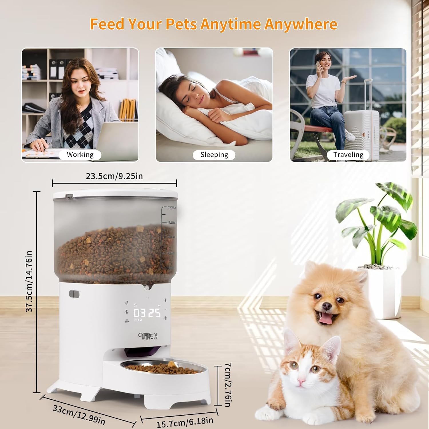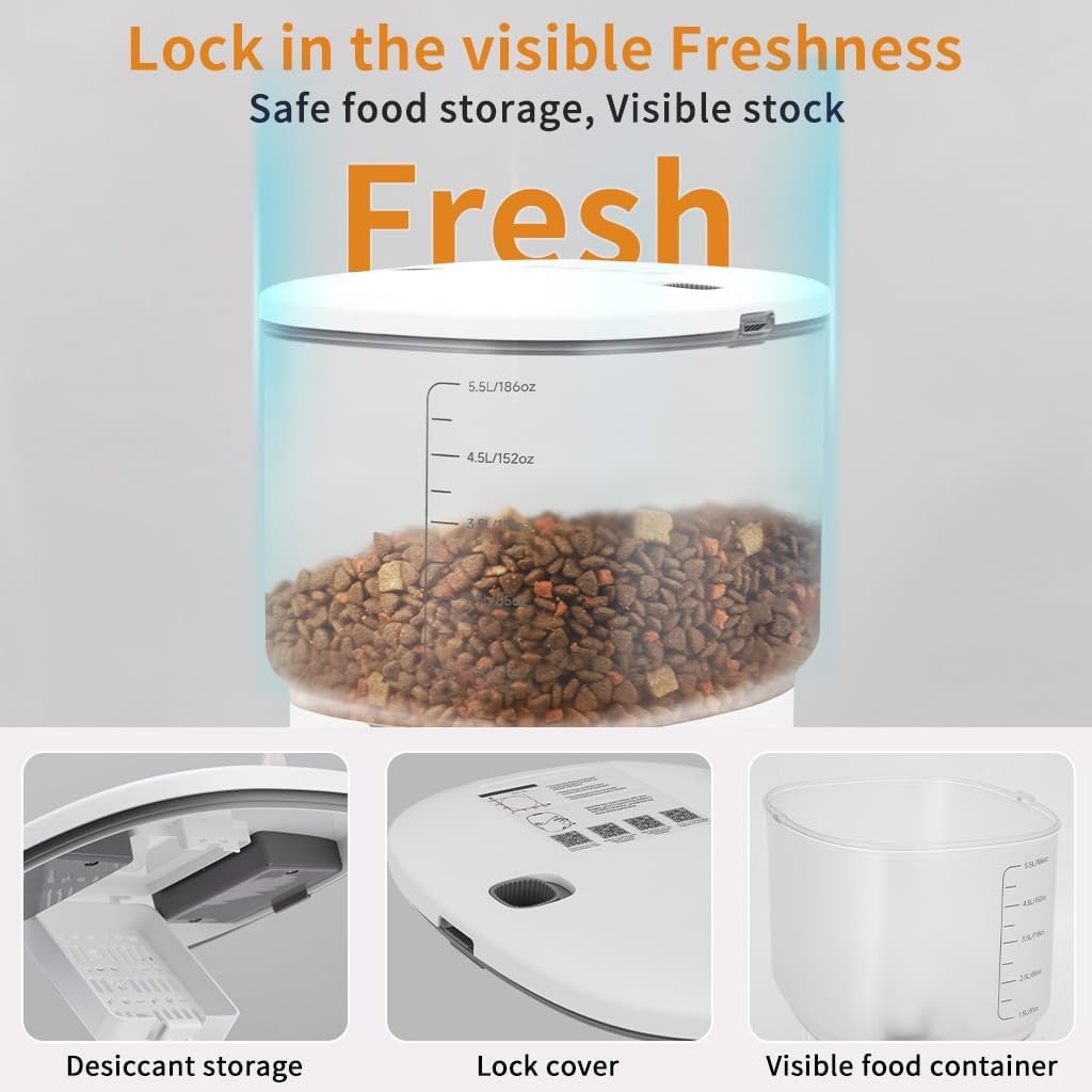 KEEP KIBBLE FRESH: EVERY TIME: – WHDPETS Dog Food Dispenser with timer adopts a locking lid on the top, firmly locking the top of the granary, preventing pets from stealing food and completely isolating the air, ensures pet food stays fresh and crispy, providing your pet with a clean and fresh eating experience with every bite. Plus, we offer extra desiccant bags for freshness.