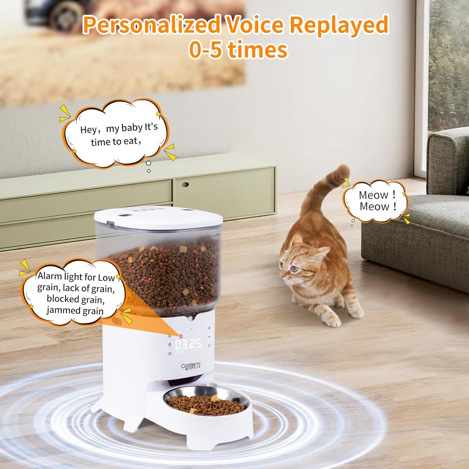 EASY-TO-SET LCD PANEL – A clear LCD screen and detailed instructions ensure you can effortlessly set up a timed cat feeder to meet your specific needs, let you know every status of the auto cat feeder. Record up to 10 seconds of messages, upgraded voice cycle function, you can set up to repeat up to 5 times the voice to call your pet for the feeding time, so it feels loved and cared for in your absence.