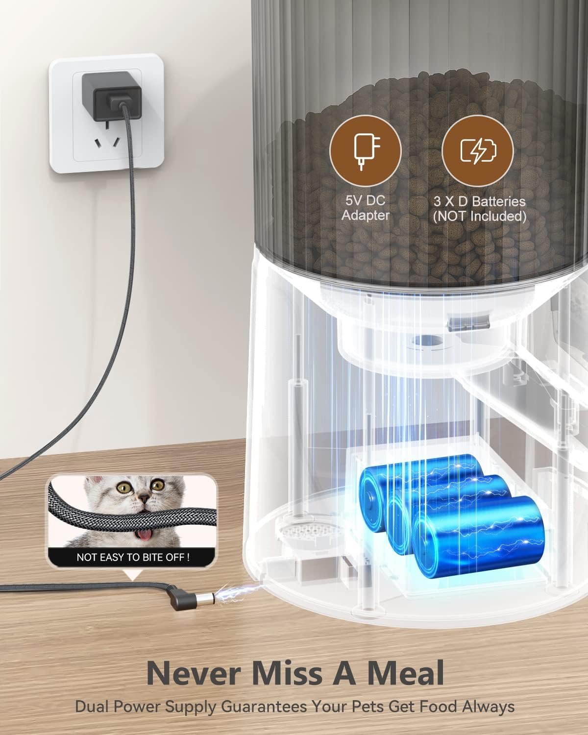 ✅Dual Power Mode:Our automatic pet feeders is powered by a power adapter and 3 D-size batteries(not included), which ensures that your pets get fed even in a power outage. Recommended using both the battery and adapter in case any of the power is cut off.