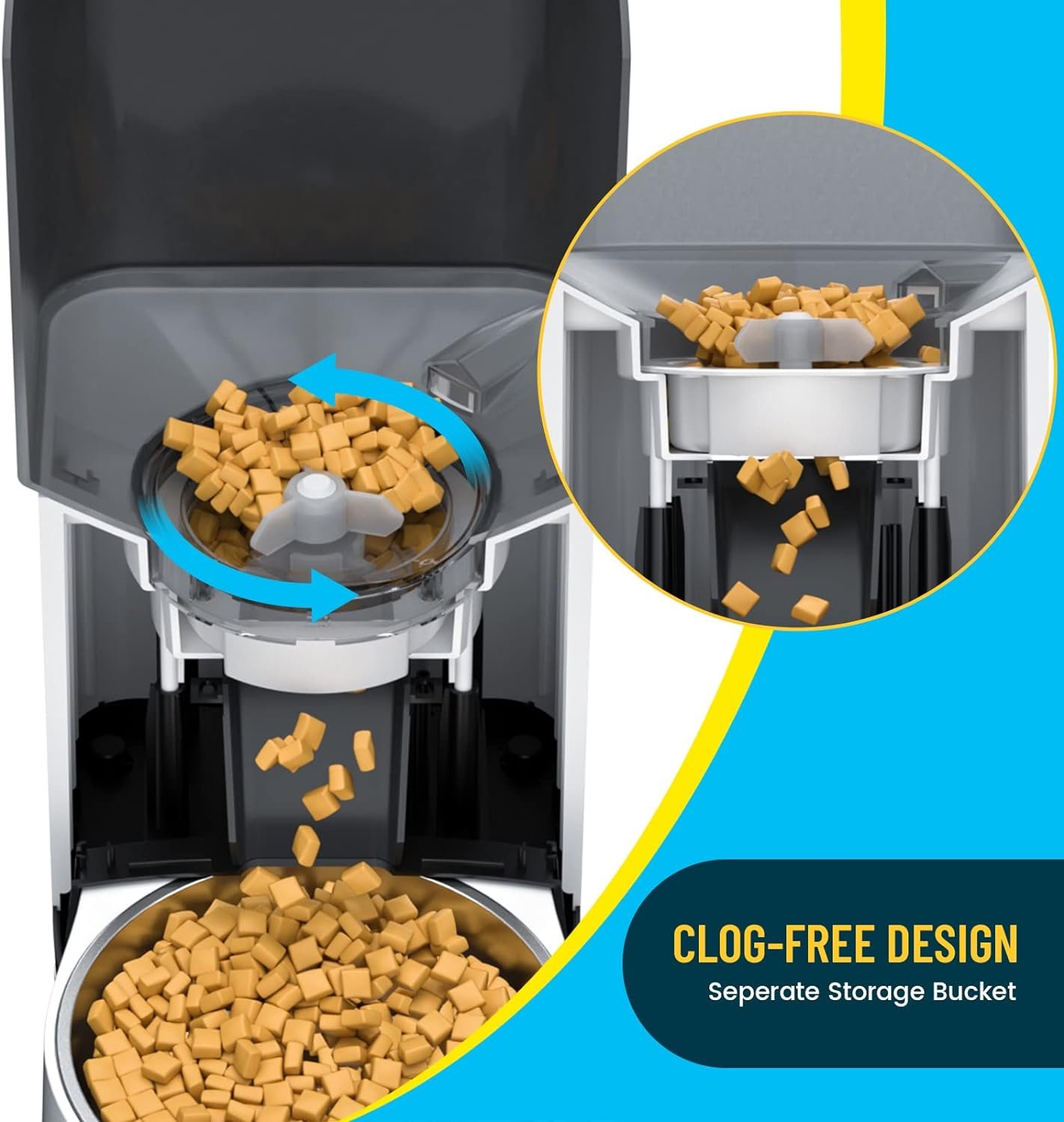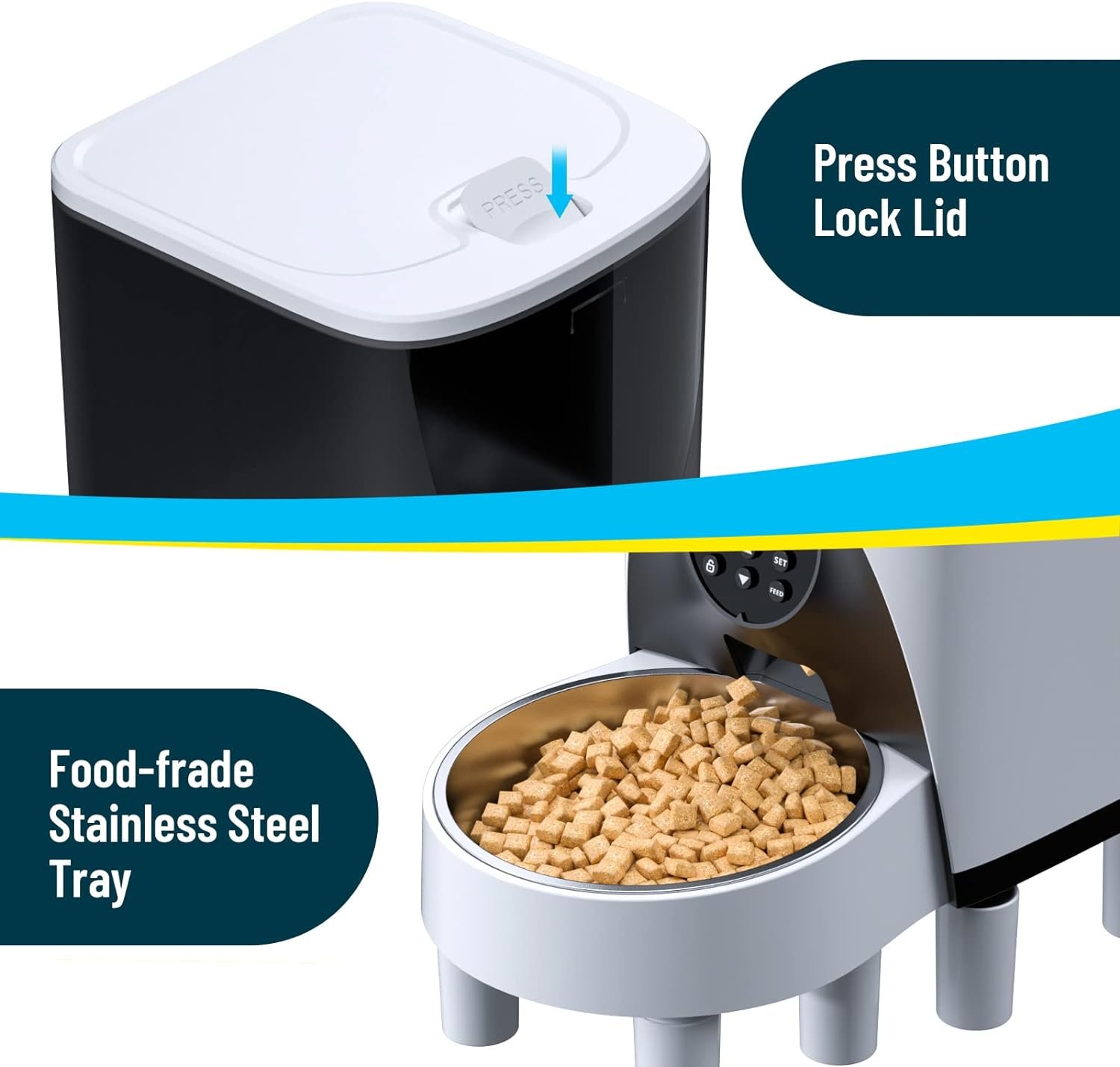 🐾 User Friendly Design: The cat food dispenser has a transparent hopper,making it easy to see remaining food and replenish in time.The press button cover prevents the pet from turning over the food.Attached stainless steel food bowl is easy to clean.