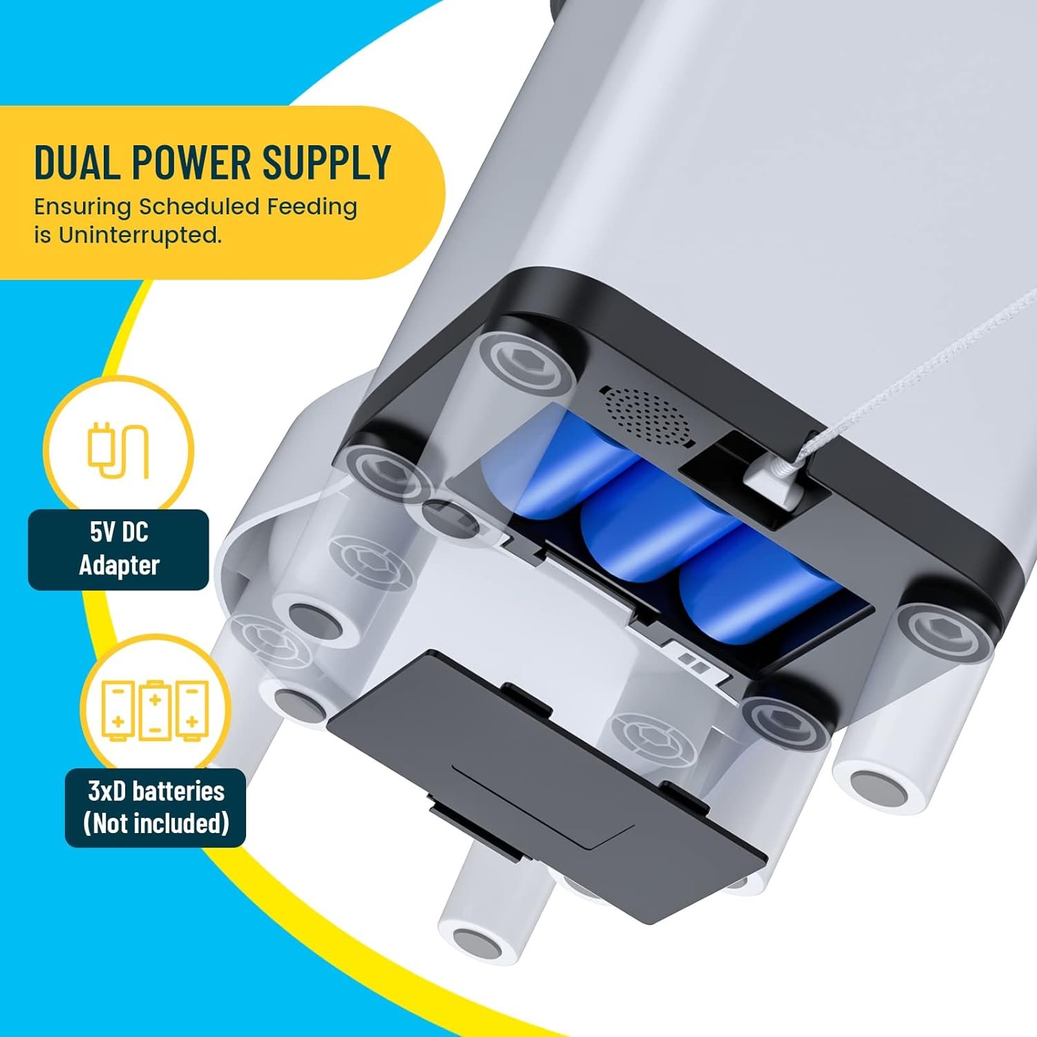 🐾 Dual Power Supply: The pet feeder automatic use a power adapter and 3 D-size batteries are used for the pet feeder at the same time.Batteries installed as back-up power to ensure automatic feeding in case of power failure(batteries not included).