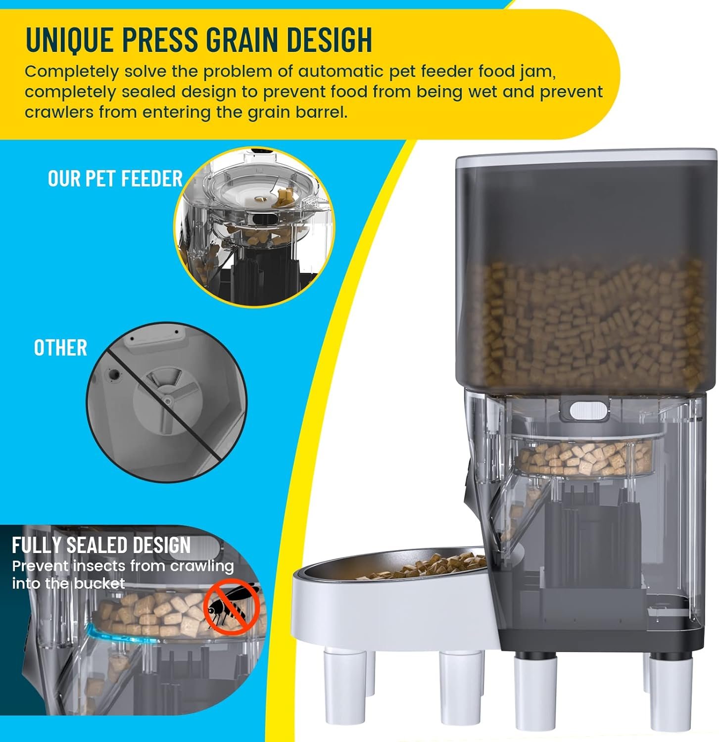 🐾 4.5L Large Capacity & Keep Freshness : The automatic dog feeder consistently provides food for your pets smoothly for few days,It can only be used for dry food with the food size between 0.08 and 0.5 inches.The large capacity ensures your pets stay full no matter where are you. Also the cat feeder built-in desiccant bag, sealed top lid and embedded grain outlet design, triple seal lock the freshness to keep food fresh and crunchy.