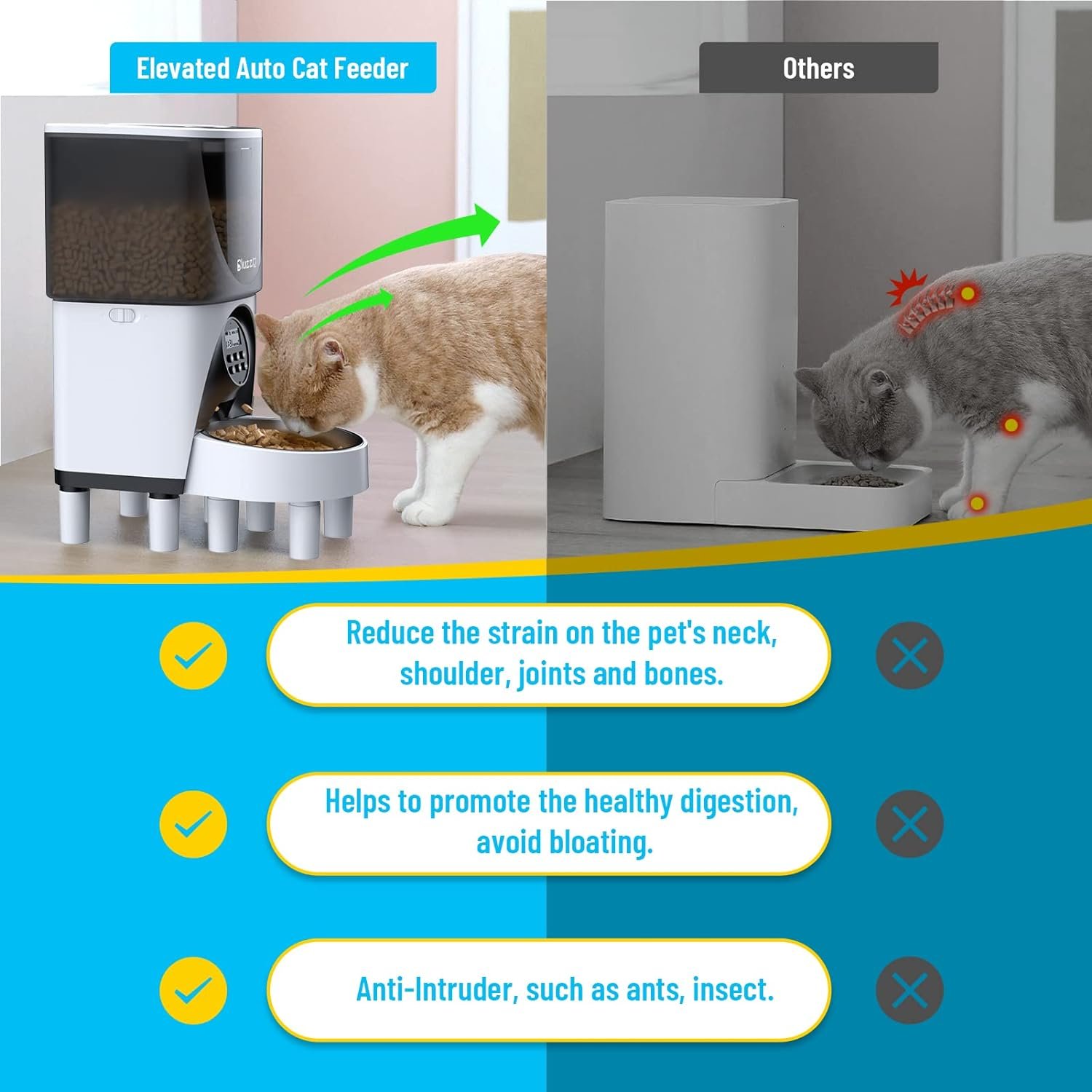 🐾 Elevated Feed Bowl: The BLUZZO elevated automatic cat feeders comes with 3.54in raised legs, which can raise the height of the bowl. Using elevated auto cat feeder helps reduces the neck pressure, relax their bodies when your cat/puppy eating food. Especiallyfor the older cats or mobility issues pets. And it also prevent strong dogs and cats from nudging bowls around the floor and tipping the contents out.