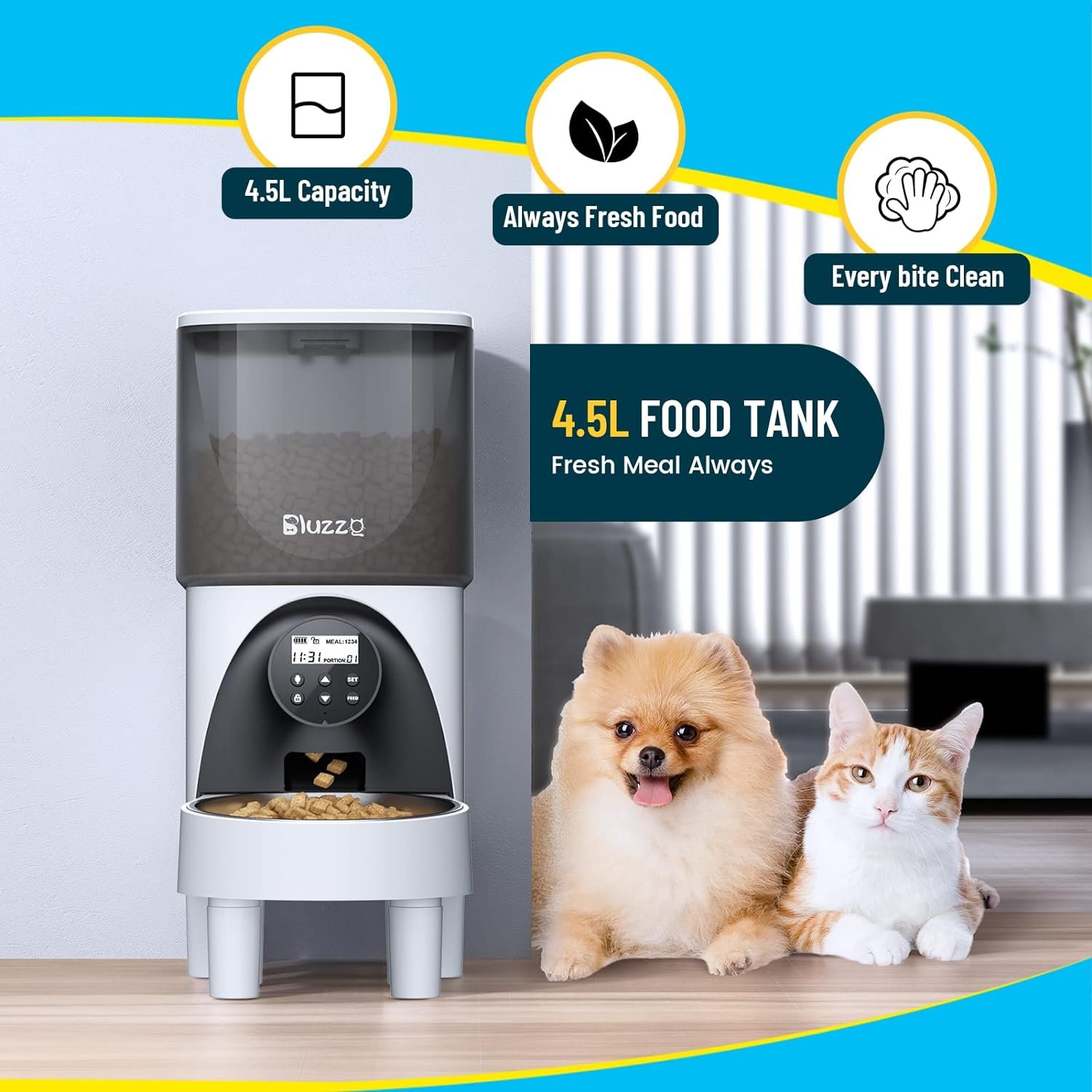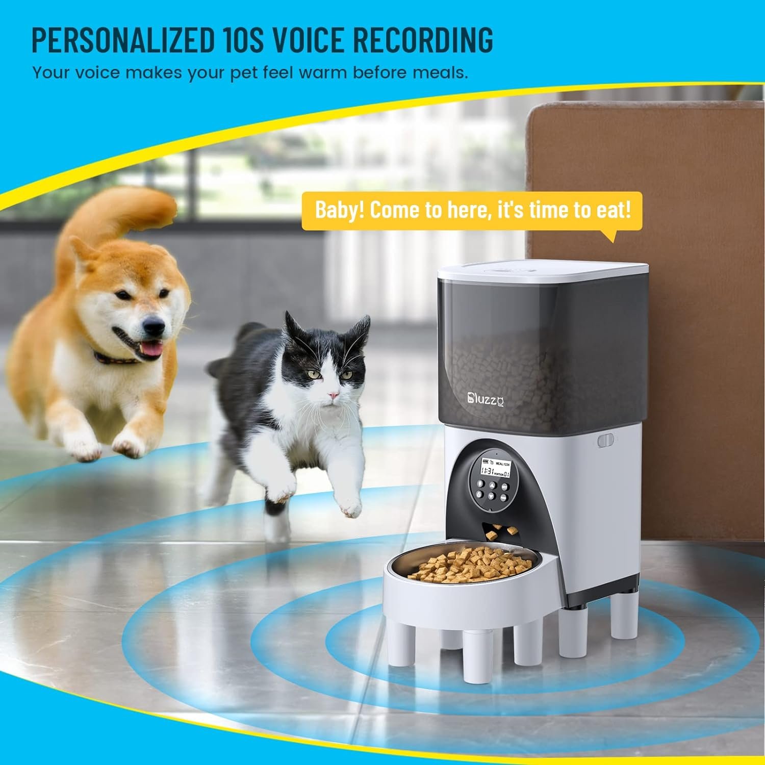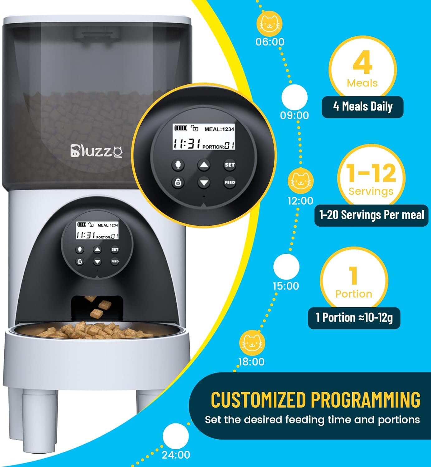 🐾 Schedule Meal Times:Bluzzo automatic cat feeder could program up to 4 meals a day to feed your pet,up to 20 portions per meal (1 portions= 10g),which can help keep your dog or cat on a good feeding schedule.Timed program and customized daily meals to dispense food in right time,never miss a meal when you are working overtime or travelling.