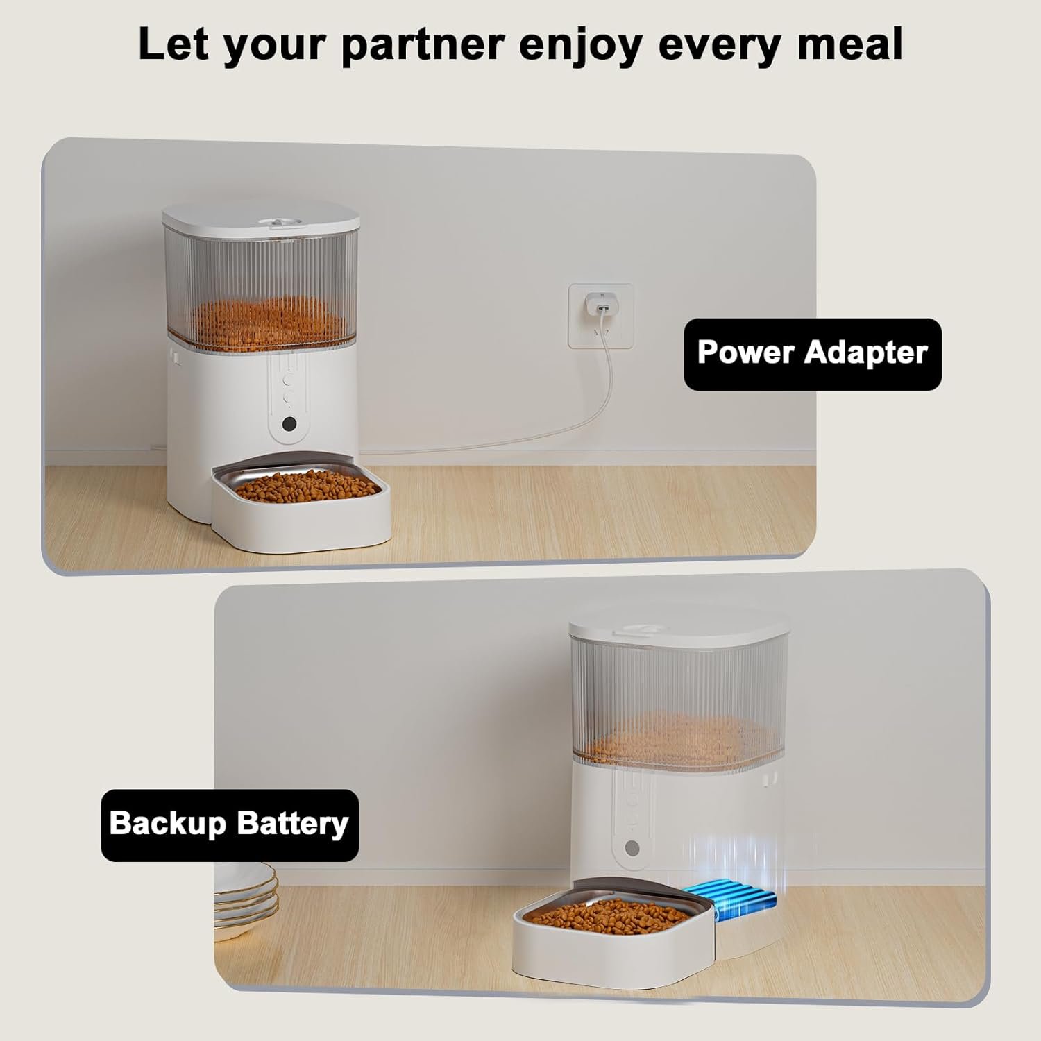 🐱【Dual Power Supply】Use the adapter to power the dog feeder with camera. Alternatively, install 3 alkaline D-size batteries (not included) . We recommend using both methods together ,In the event of a power outage, the smart pet feeder will continue to run on 3 D-size batteries to ensure your pets never miss a meal. Equipped with setting memory to prevent sudden power failure