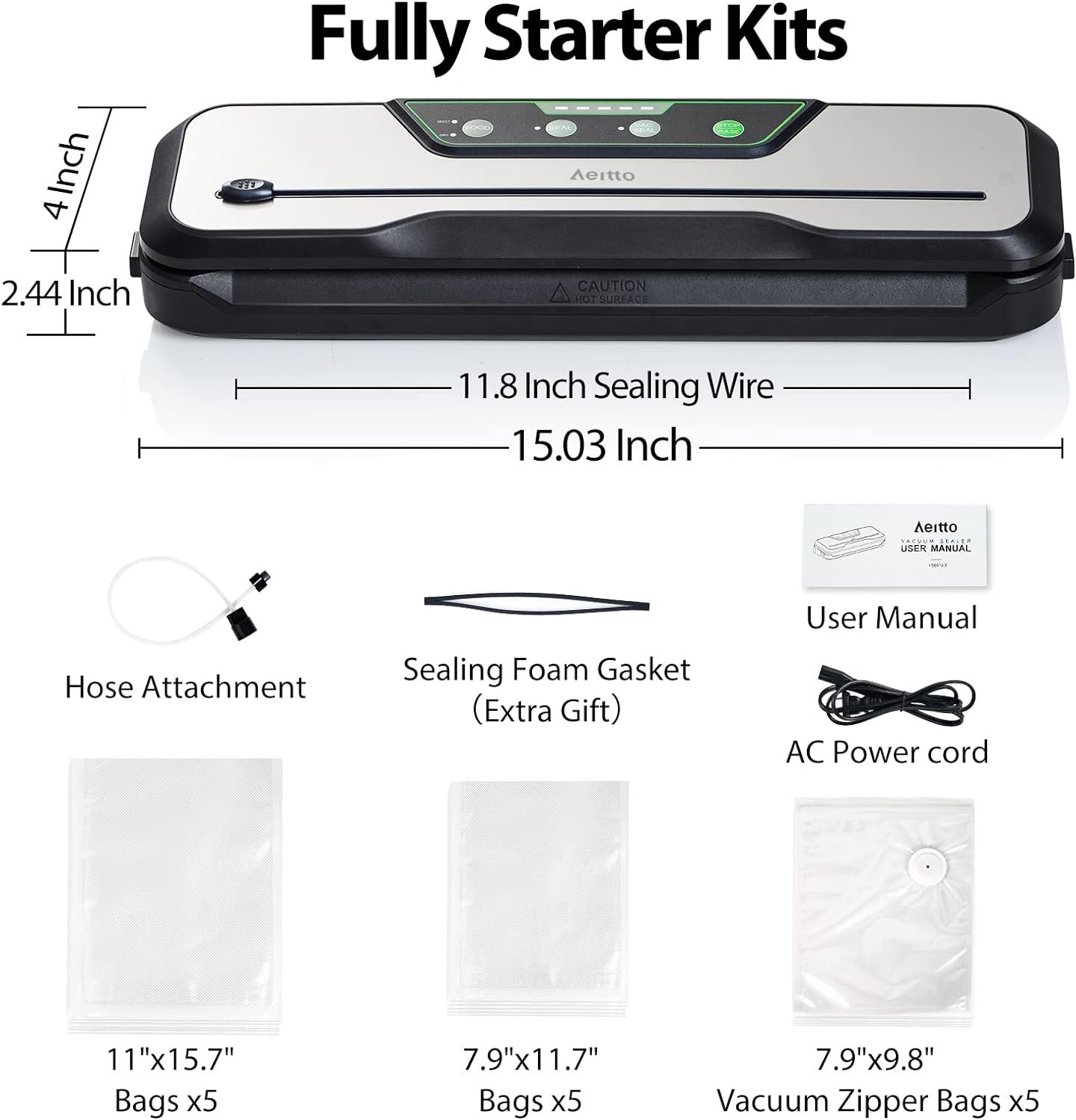 Package Includes: Vacuum Sealer Machinex*1 11″*15.7″ Vacuum Bags*5 7.9″*11.7″ Bags*5 9.9″*7.9″ Zipper Bags*5 Hose Attachment*1 Foam Gasket Replacement*1 User Manual *1 AC Power Coard*1