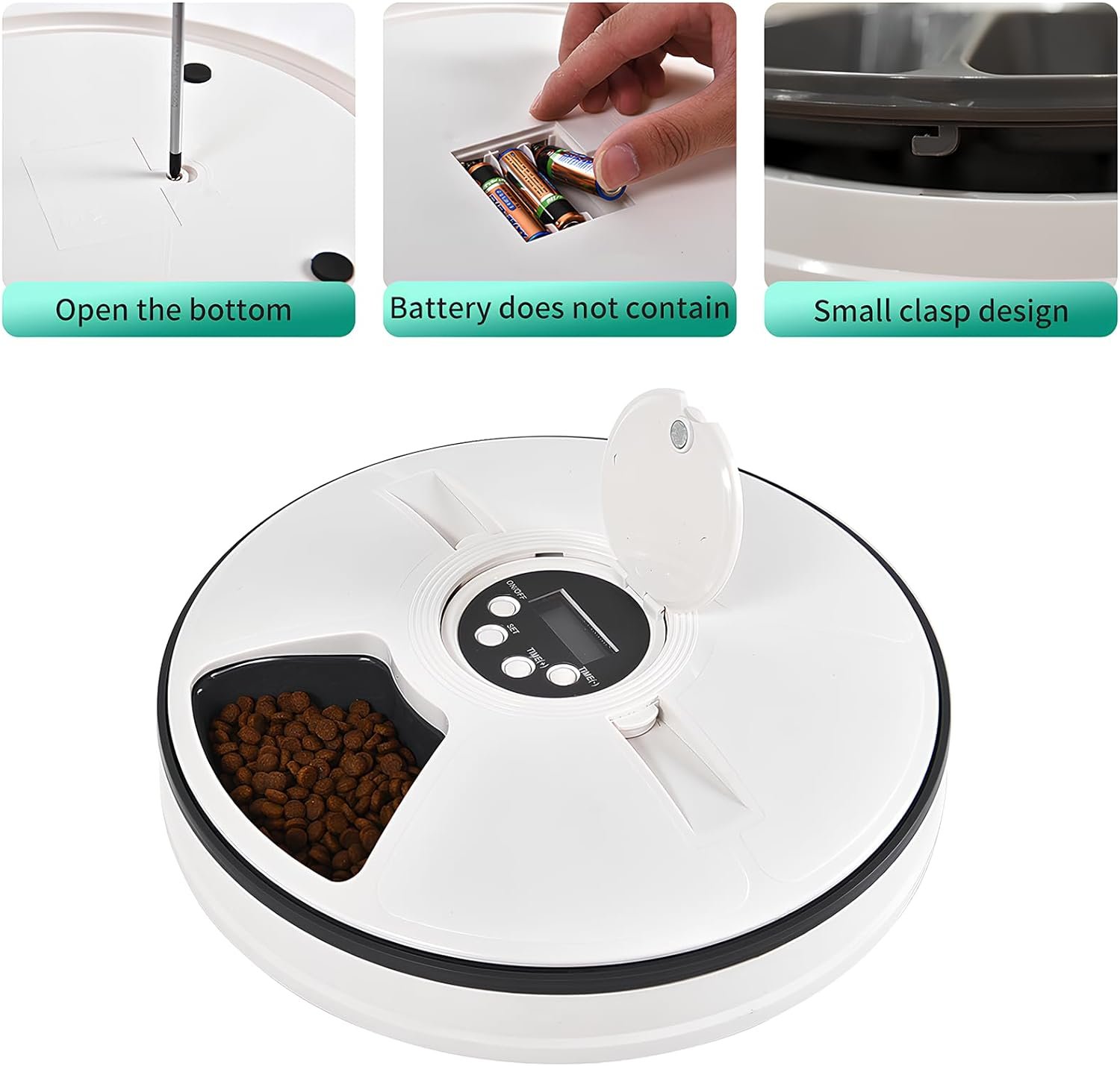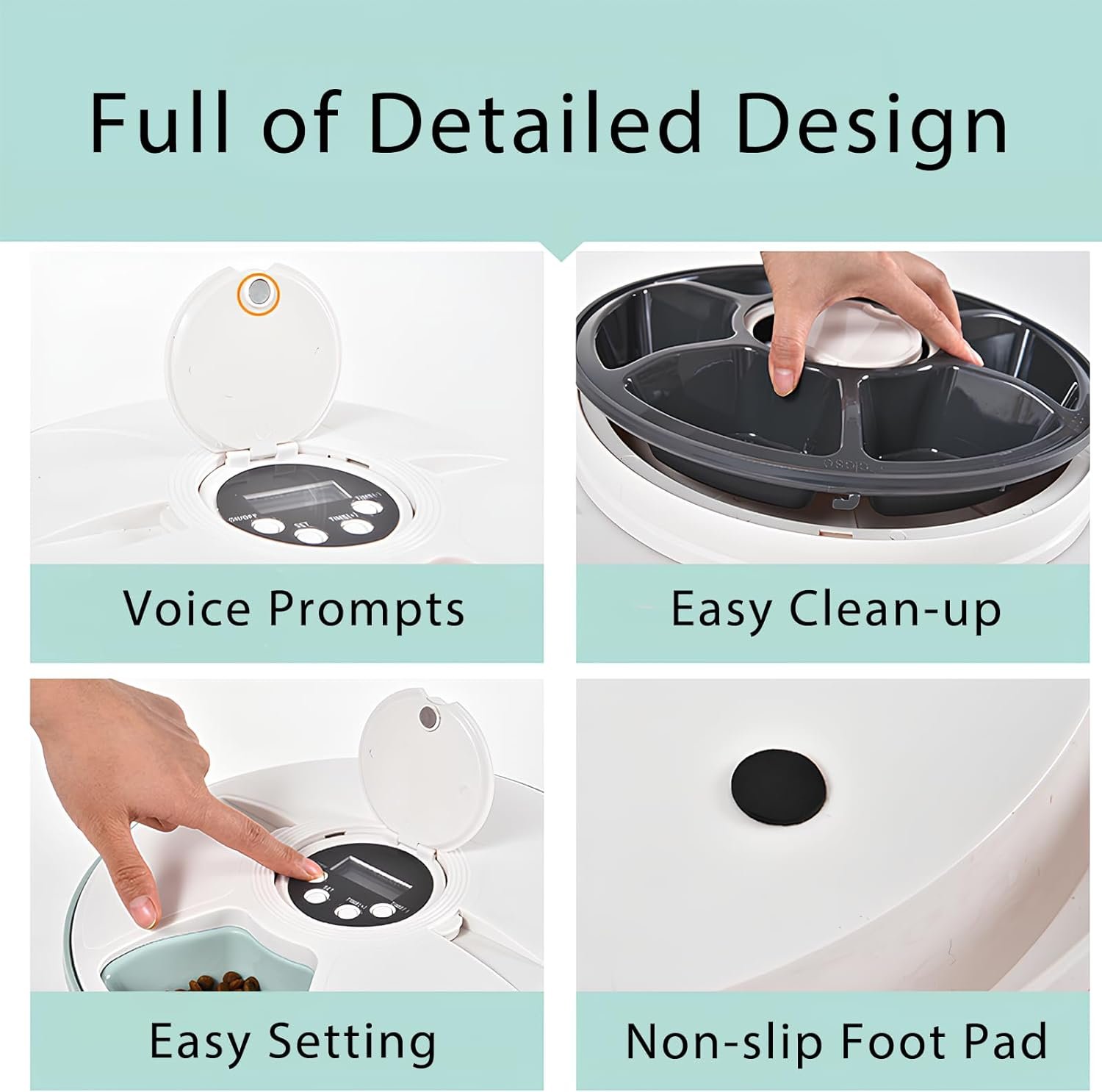 【Care for Your Pets】These automatic cat feeders incorporate a paw-care design to prevent potential injuries. Crafted from food grade BPA-free ABS material, it prioritizes your pet’s health. Both the top cover and food tray are easily removable for cleaning-simply rinse under running water. Note: Avoid getting the electronic components wet when cleaning.