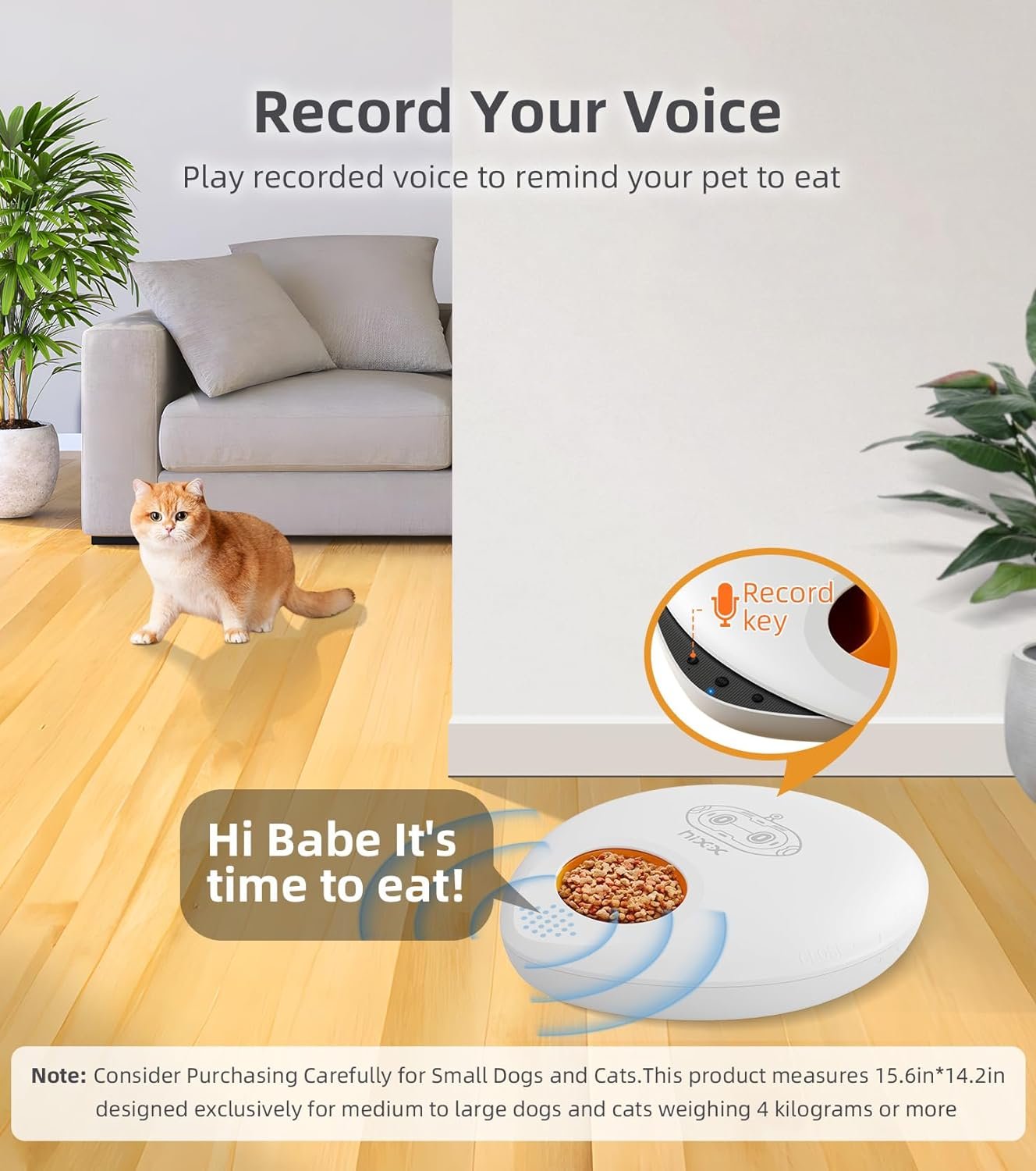 【Interactive Voice Personalization】An innovative voice recording feature enables you to record a personalized message of up to 10 seconds by simply holding the button after the ‘di’ tone. This heartfelt reminder will play before each scheduled mealtime, creating an engaging experience that calls your pet to their delicious feast.
