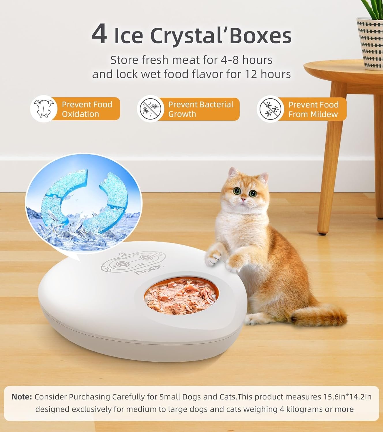 【Unmatched Freshness Preservation】Our advanced pet auto feeder comes equipped with 4 reusable ice packs nestled at its base, designed to maintain a lower temperature and extend freshness for up to 24 hours. This ensures your furry friend enjoys every meal as if it were just prepared, eradicating concerns about food spoilage.