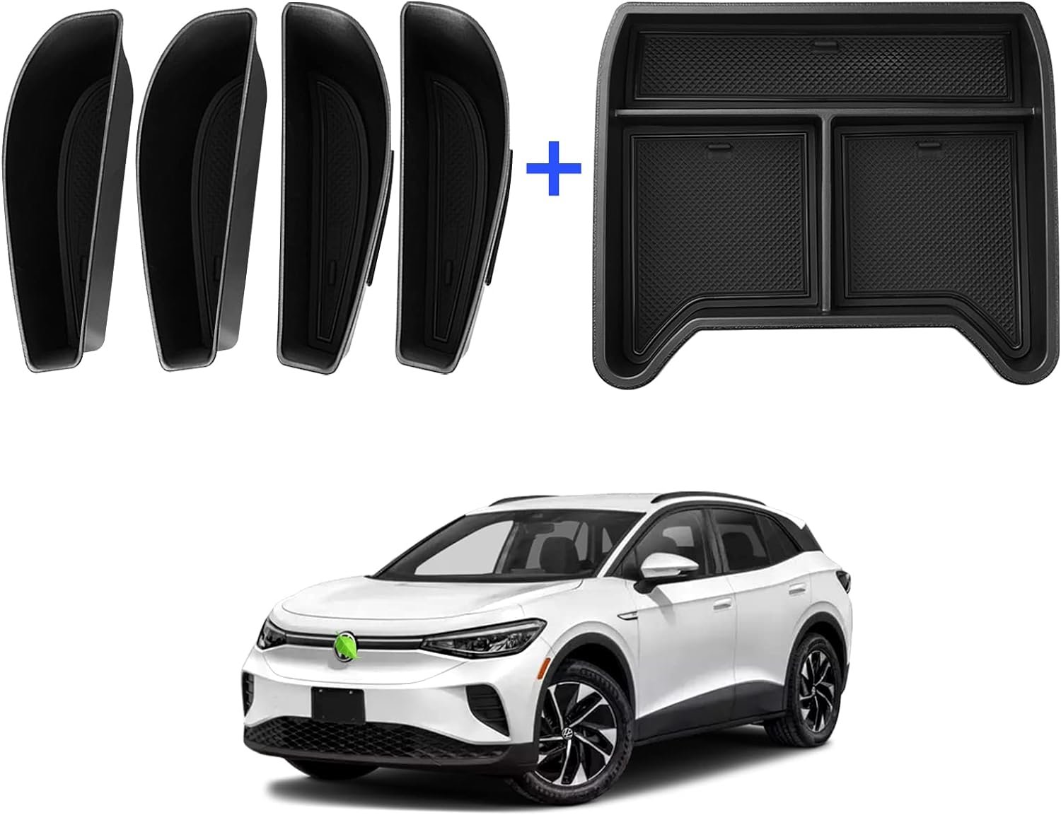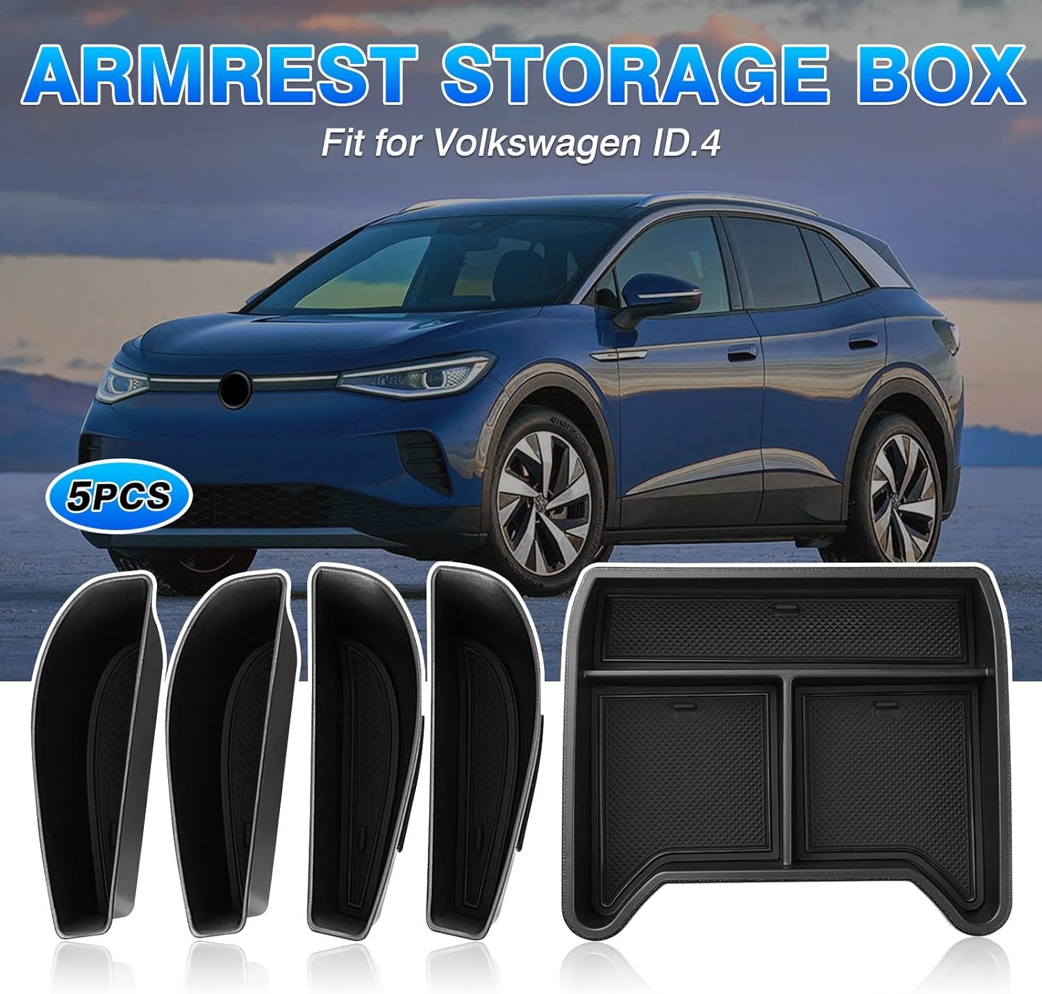 🚗Specific To ID.4—Great center console organizer for Vokswagen ID.4 VW ID4 2021 2022 2023 2024. With its durable structure and convenient features, they are absolute accessories for your daily driving.Note:One order comes with 1*Center Console Bottom Organizer & 4*Door Side Storage Box.