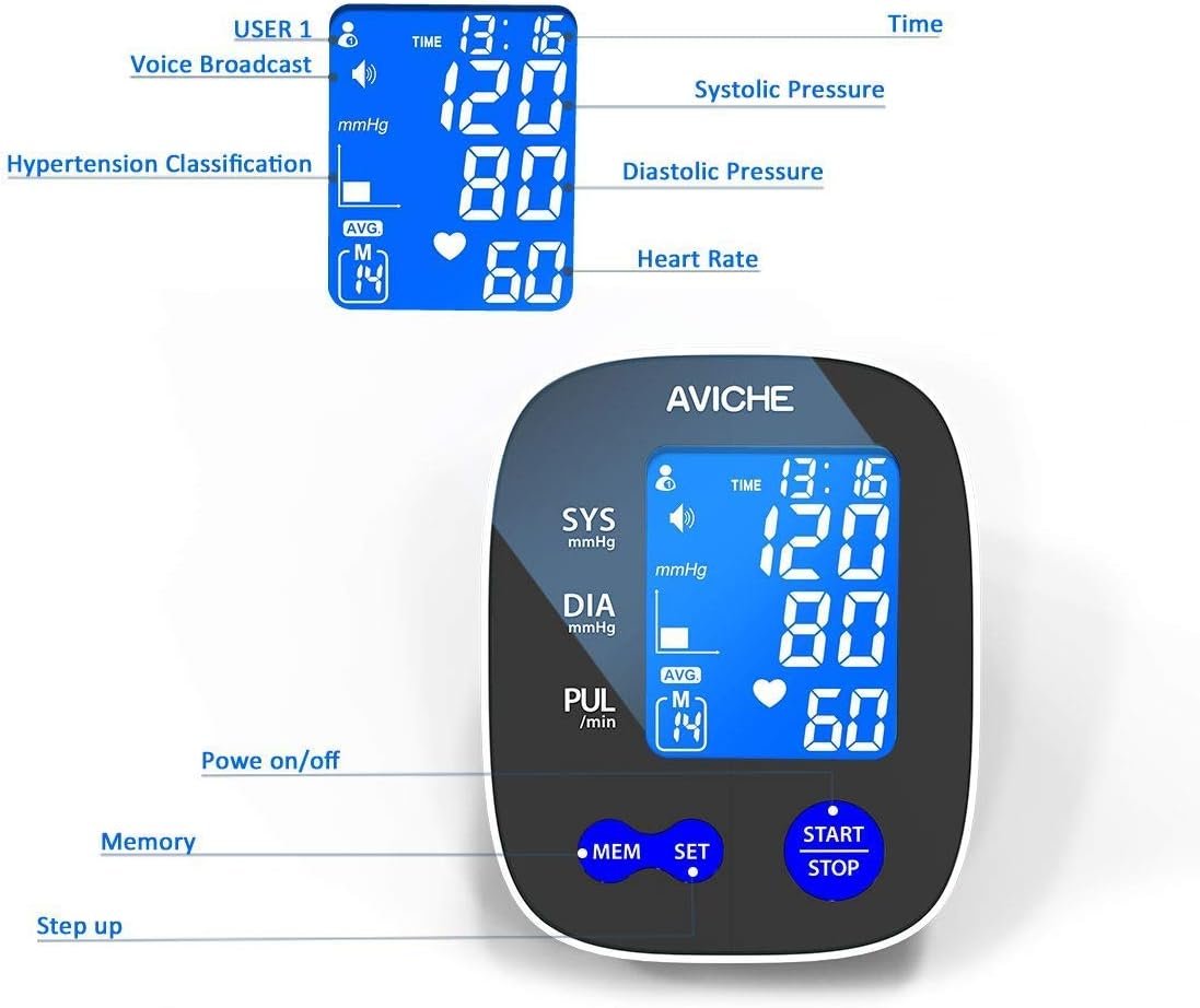 【Large LCD Display& One-button Operation】: Clinical certification. AVICHE blood pressure monitor upper arm with One-button measurement, easy to operate, you can get your blood pressure and heartbeat results on backlit screen with multi-colored LCD indicator lights even at night