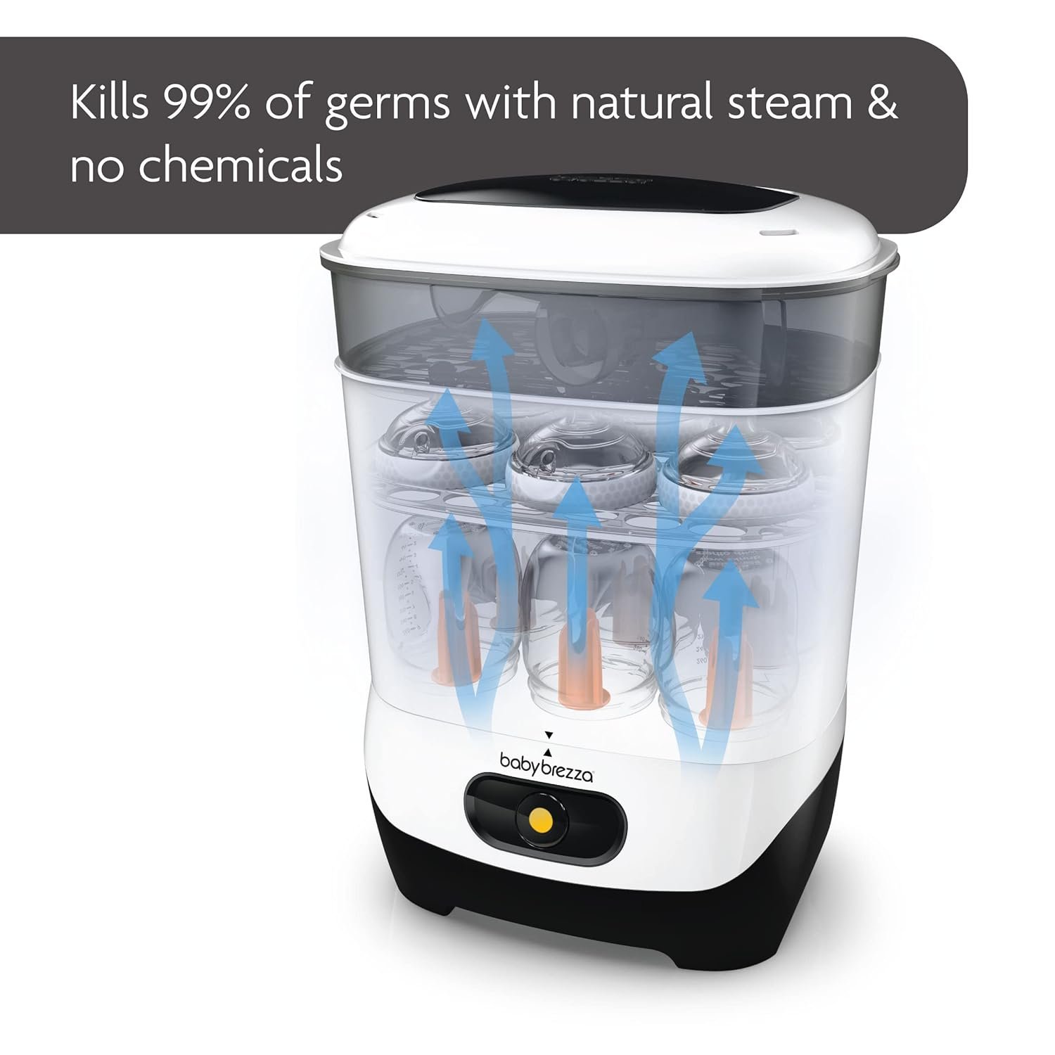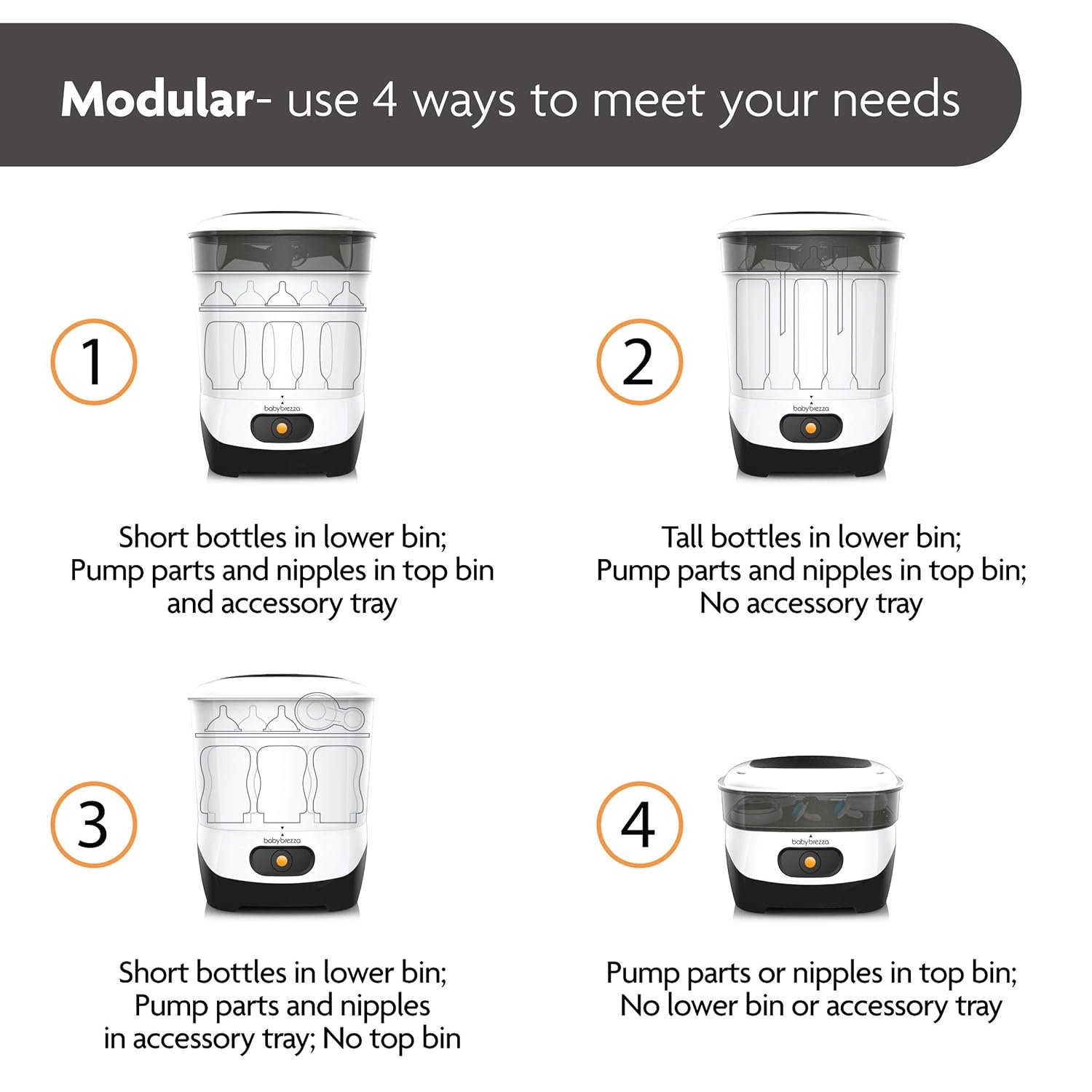 Sterilizing bottles, breast pump parts and other accessories has never been easier than with the new! Baby Brezza One step sterilizer. It sterilizes with natural steam. The one step sterilizer has the highest capacity of any sterilizer, holding 8 bottles and 2 full pump part sets from any brand. It’s also modular and includes several bins and trays allowing you to use it 4 different ways based on your needs. Products remain sterilized for up to 24 hours or until the lid is opened. It easy to use with a single on/off button..