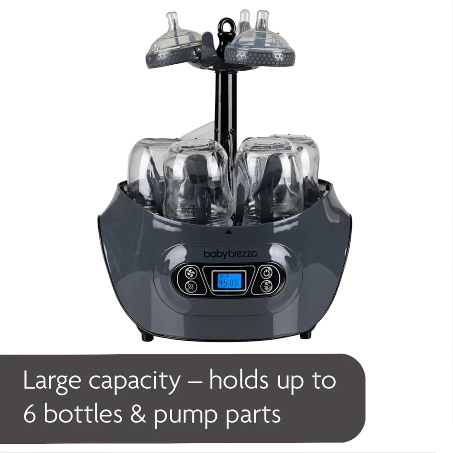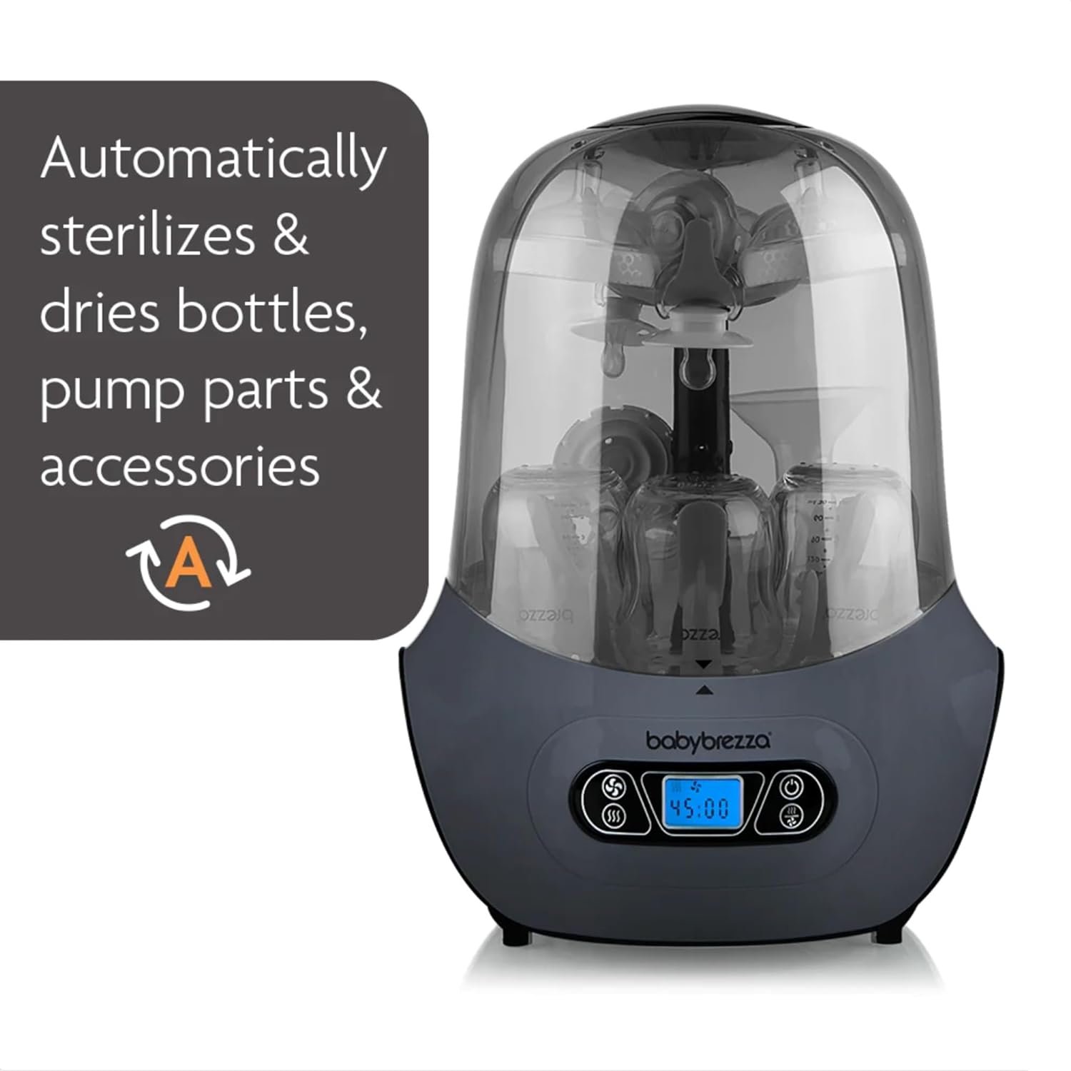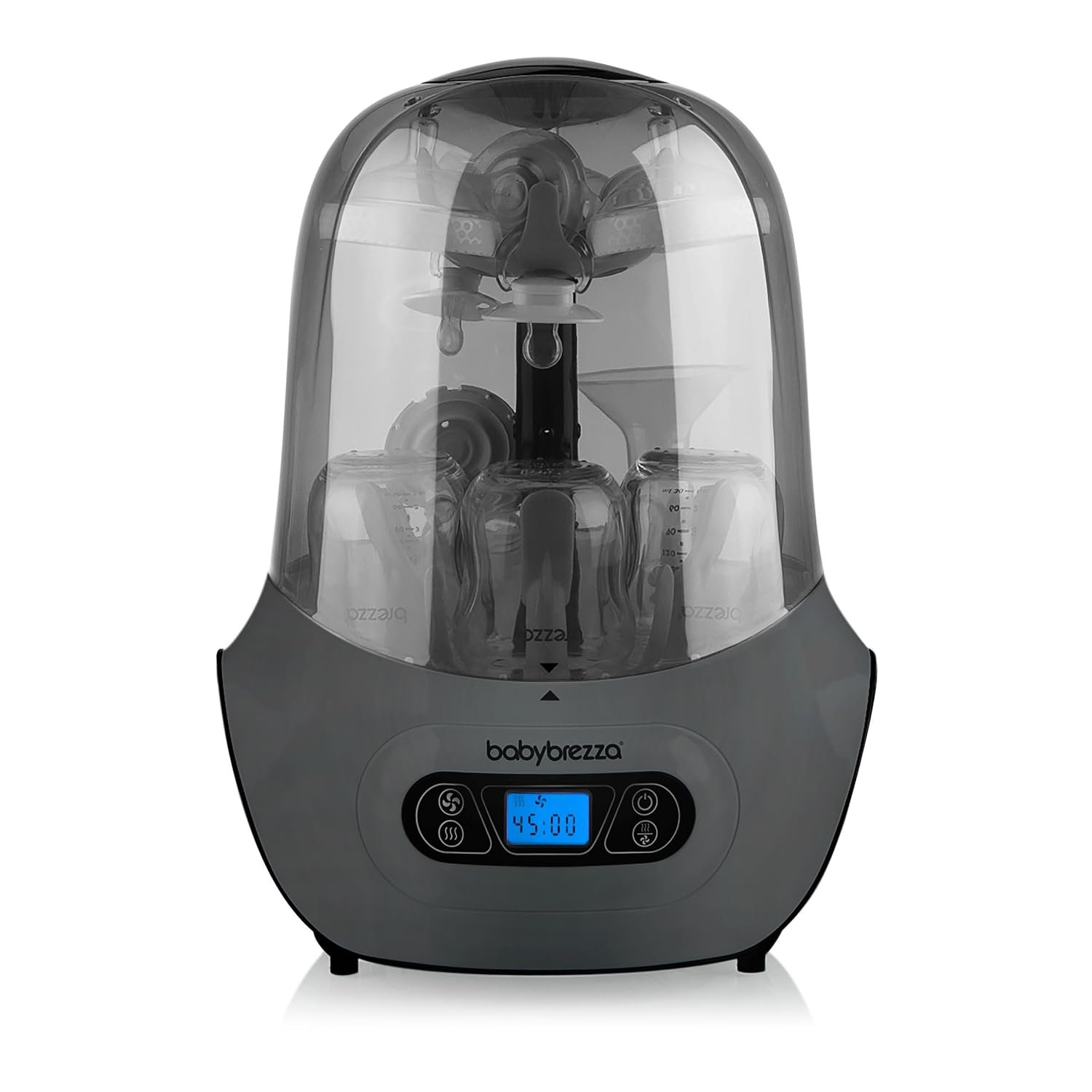 Make sterilizing and drying bottles, pump parts and accessories easy with the Baby Brezza One Step™ Sterilizer Dryer. In one easy step, you can automatically sterilize and dry up to 6 bottles, pump parts, pacifiers and more from any brand. The machine uses natural steam to effectively sterilize, then dries with hot air. You can use the LCD control panel to select from four functions (Sterilizer & Drier, Sterilizer Only, Dryer Only or Storage Rack) and three drying times (30 min, 45 min, 60 min). Products remain sterile inside for up to 24 hours until the lid is opened. The Sterilizer Dryer has a stainless steel heating plate that protects against rust and hard water buildup.