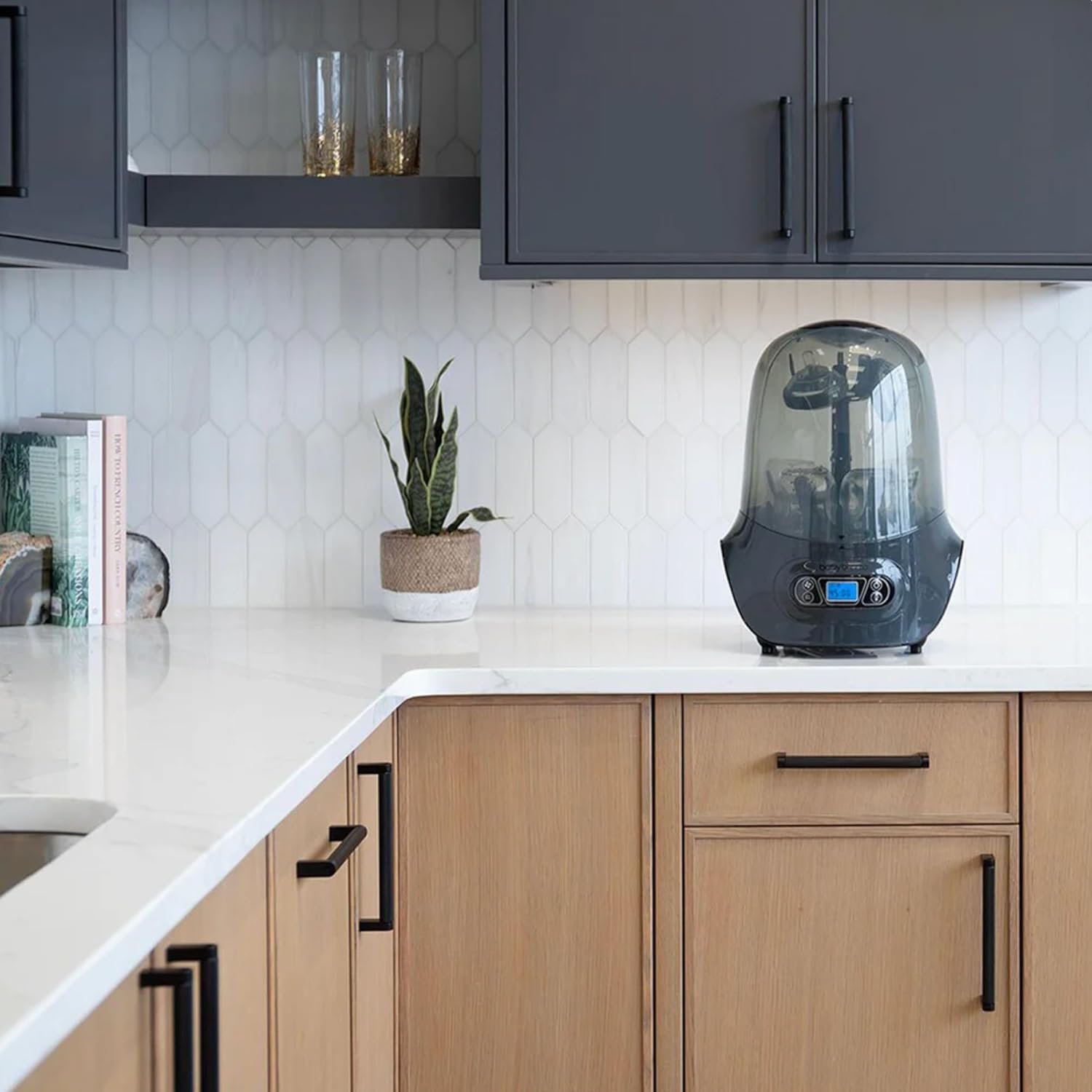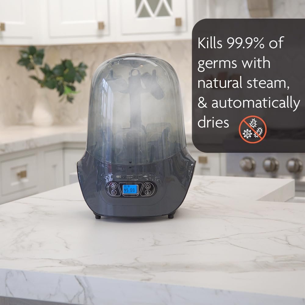 KILLS 99.9% OF HARMFUL BACTERIA, THEN DRIES AT THE PUSH OF A BUTTON. Uses natural steam (not chemicals) to eliminate germs, bacteria, mold and the yeast that causes thrush. Then dries with hot air. Doesn’t require expensive replacement filters
