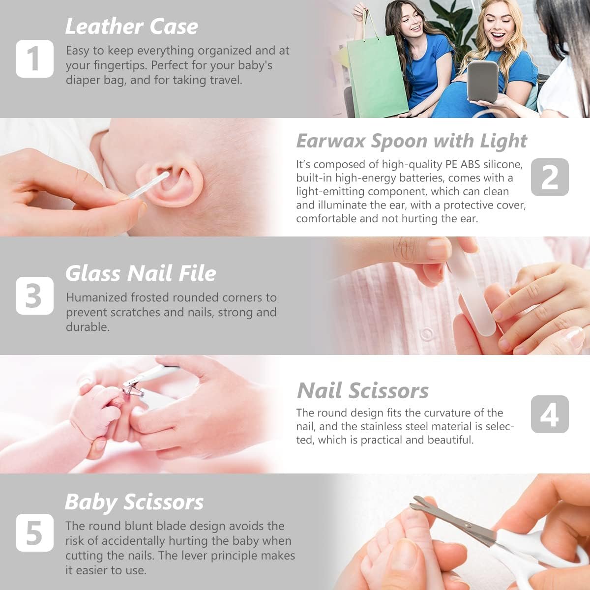 👶【HIGH-QUALITY PRODUCTS】Registry Must Have! Scissors with round blades, combs with round teeth and soft brushes, ear cleaner with LED lights to ensure safe visibility, gentle silicone toothbrushes suitable for sensitive gums, nasal suction devices that can easily clean nasal dirt, etc., provide the best daily care for your baby in all directions.